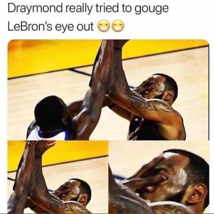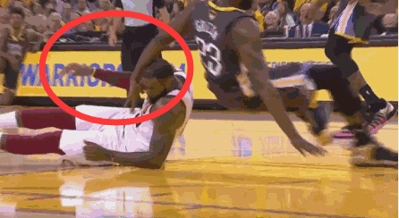 除了第一场比赛已经造成詹姆斯眼睛不小的伤害之外,格林在第二场比赛中又一次如法炮制。同样是格林在阻拦詹姆斯进攻后,看似无意的摔倒过程中,格林的黑手再次伸向詹姆斯的眼睛,好在这一次三旬老汉受伤的右眼幸运逃过一劫,没有被格林戳到罢了,只是被格林手肘打到脸部。
