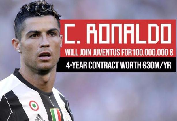 C罗真的加盟尤文,整个意甲为之疯狂!随着尤文图斯官方正式宣布,球队花费1亿欧元转会费用,从皇马队引进了葡萄牙天王克里斯蒂亚罗纳尔多,C罗与尤文签署了一份为期4年年薪高达3000万欧元的合同。新赛季C罗将会身披尤文图斯的战袍,亮相亚平宁半岛。
