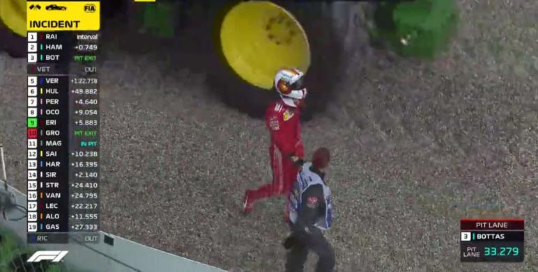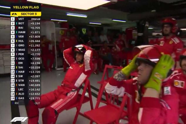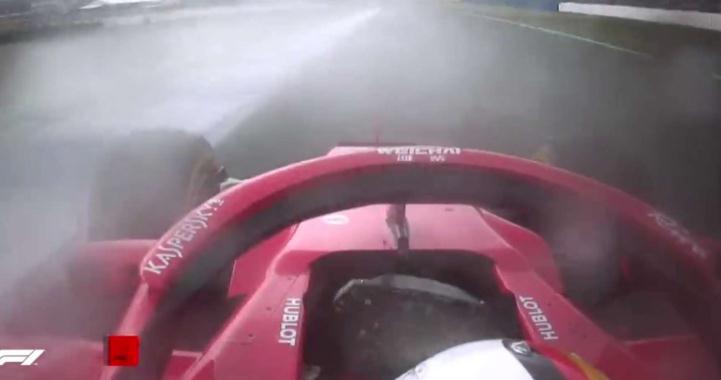 随后没过多久,就出现了维特尔将车撞出赛道的一幕,不得不说德国人真的是不会开雨站的车手。如果此时法拉利没有给KIMI下让车指示,而是让芬兰冰人继续领跑,或许场面将会完全不一样。随着维特尔将车开出赛道,安全车出动后,法拉利车队的反应也明显比梅奔慢了半拍,在其他车队纷纷利用安全车出来的时候,选择进站更换轮胎,法拉利这边只是让kimi继续在雨中赛道上跑着。