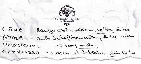 科普克塞给了门将莱曼这张纸条9厘米宽,10厘米长,是一张来自格鲁内瓦尔德皇宫酒店的便筏,上面清楚写着阿根廷队将踢点球的球员名单,以及他们踢前准备和点球方向。正式有了这张绝世秘籍,莱曼成功扑出阿根廷队的2粒点球,帮助德国队挺进半决赛。