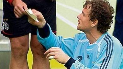 这张世界杯上最著名的字条,出现在2006年德国世界杯1/4决赛德阿大战中。当时两队来到残酷的点球大战,而此时德国队门将教练科普克塞给德国门将莱曼一张字条。正式这张神奇的字条出现,宣判了阿根廷队的死刑。