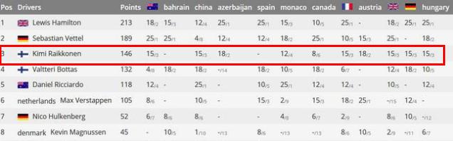 本赛季到目前为止,莱科宁在进行的12场比赛中,只有2场比赛未能完赛,而这两场比赛之所以没有成绩,完全是要怪罪于法拉利车队。先是在巴林站,本来有夺冠的机会下,因为在维修站内车队机械师的失误,造成Kimi无奈退赛。而在西班牙站的比赛中,因为车辆调教上出现问题,使得Kimi在正赛中车辆失去动力遗憾退赛。而其余完赛的10场比赛中,kimi已经8次登上了领奖台,这样的拿分效率相当不错。