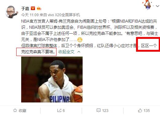 从于嘉的表态来看,他对于菲律宾有无克拉克森似乎并不关心,他强调的是中国男篮要注意的菲律宾全队,千万不要被一位区区NBA球星吓到。