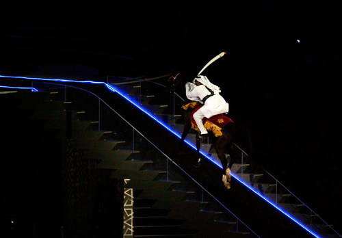 当时在场地中央,卡塔尔王国的五王子,年仅只有18岁的卡塔尔耐力赛马队队长阿勒萨尼骑马出现了,正当所有人看不懂这一幕时,亚运会史上最经典的一幕上演了。只见阿勒萨尼接过火炬,倾听祷告,突然拨转马头,策马飞奔。他一路驾驭骏马,一口气冲向317米的陡峭长梯奔向台顶,矫健而优雅的黑色阿拉伯马动作轻盈,给了所有人极大的震撼。但是由于开幕式当日天空不作美曾下过雨,导致雨水打湿了长梯的路面,阿勒萨尼和他的爱马,几次险些要滑倒在长梯,不过好在都化险为夷。阿拉伯骑士驾乘着这匹骏马飞奔到斜坡尽头的时候,一个巨大的星盘缓缓升起,旁边一弯斜月与之形成奇美的映衬。骑士缓缓点燃圣火,火焰一路向上,须臾过后,亚运圣火熊熊燃起。最终创造了亚运会史上最为经典,也最具勇气的圣火点火仪式。