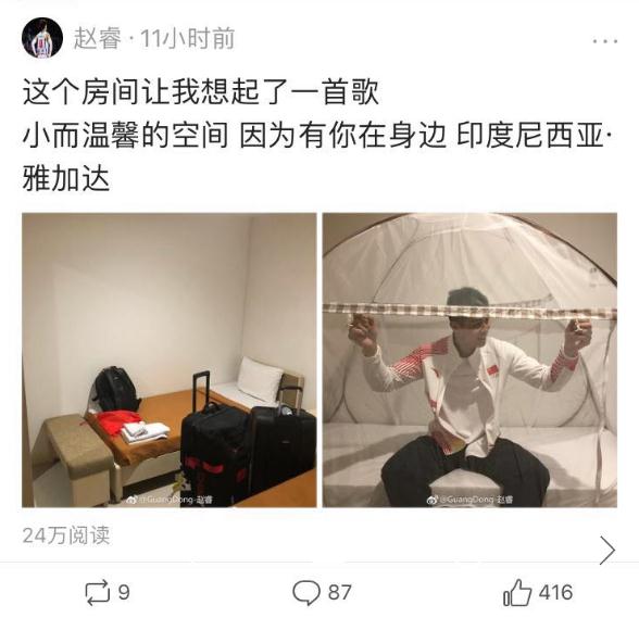 同样男篮后卫赵睿,也在个人社交媒体上晒出了主委会为男篮小伙子们准备的“温馨房间”。并且还顺带调侃了一下,和他同屋的方硕。从男篮球迷们集体的暗讽中,就可以看得出来,他们对于主委会所安排的房间是多么的不满意。毕竟男篮运动员不同于其它项目的运动员,他们的客观身材条件就摆在那,雅加达主委会如此不人性化的做法,确实太过业余。