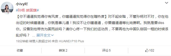 就像有网友所说的那样,“孙杨为祖国赢得无数荣誉”,“没看到孙杨带伤为国而战吗”,请别为了这点小事情上纲上线,影响到孙杨的成绩,请心疼一下我们的运动员。