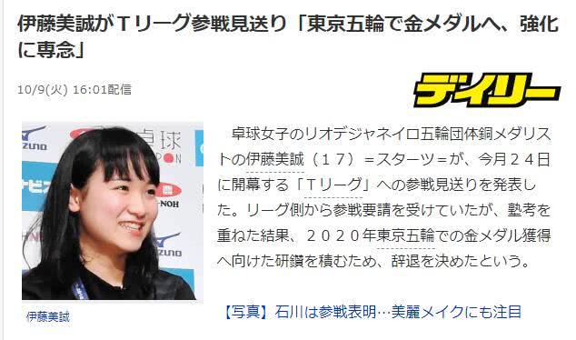近日,根据日本媒体的报道,在年初夺取日本锦标赛女单、女双、混双三块金牌的18岁日本天才少女伊藤美诚,为了专心备战东京奥运会,日前做出一个令人意外的决定,那就是主动放弃参加日本乒协首次举办的“T联赛”,从而将全部的重心投入在备战2020东京奥运会上。