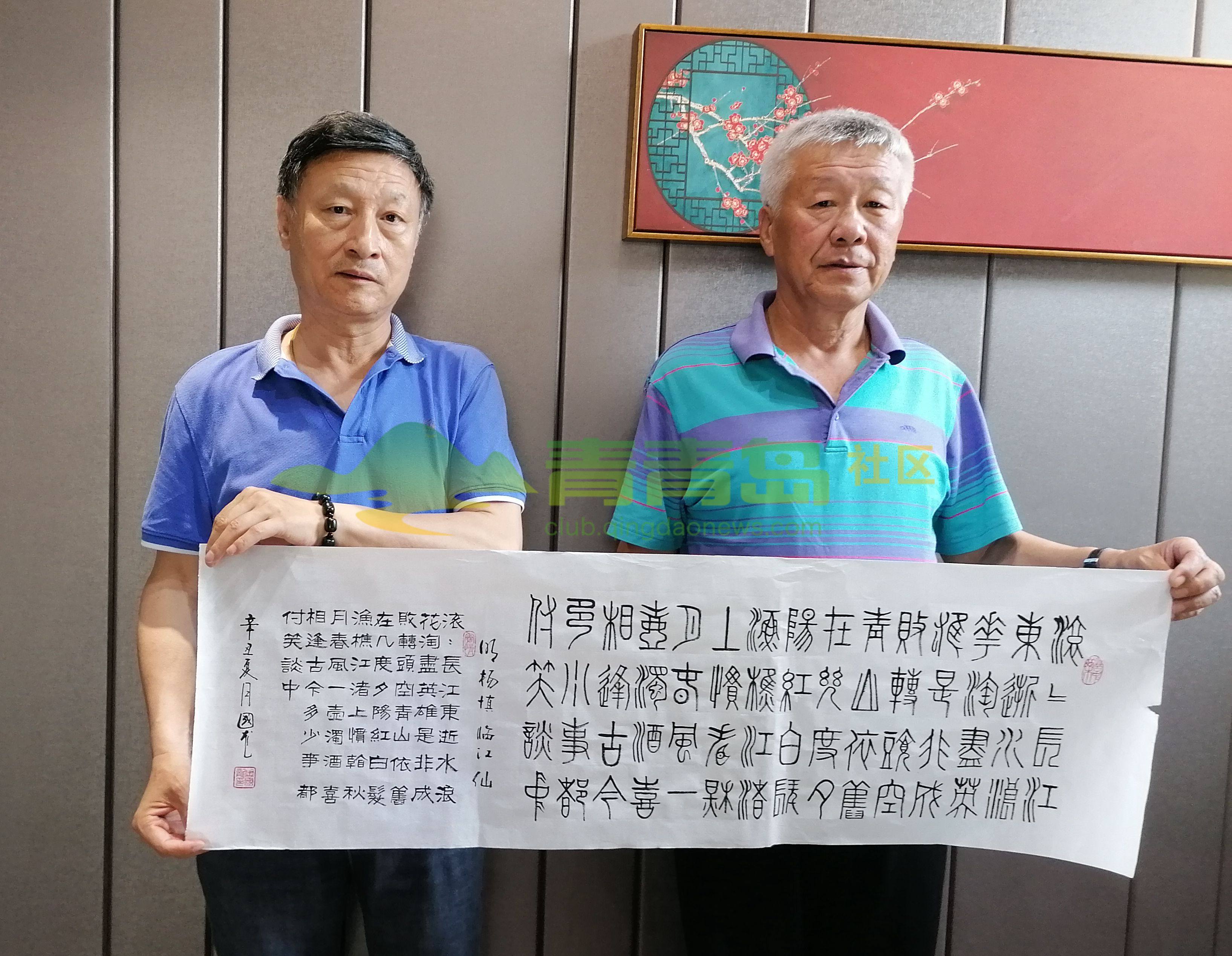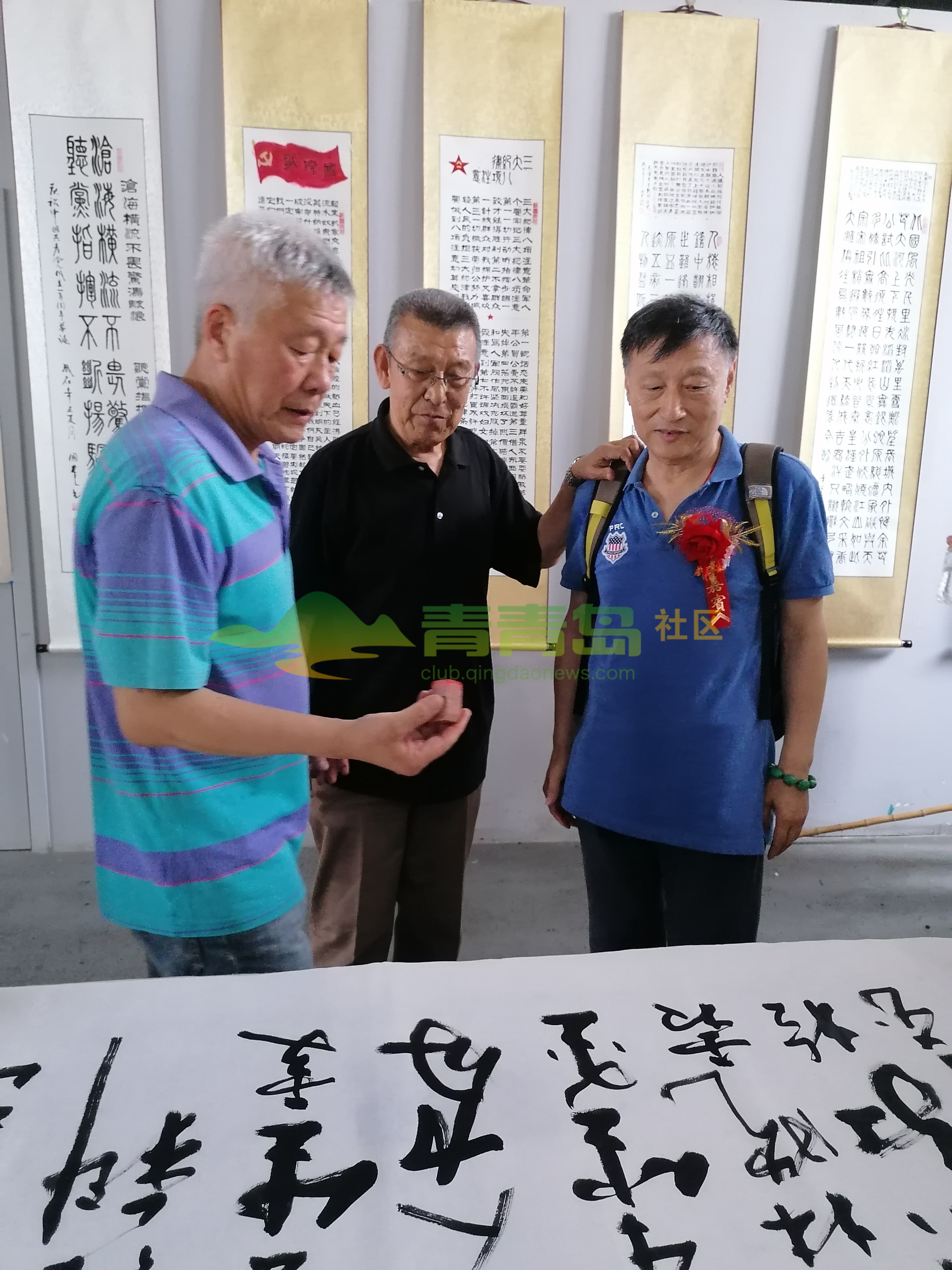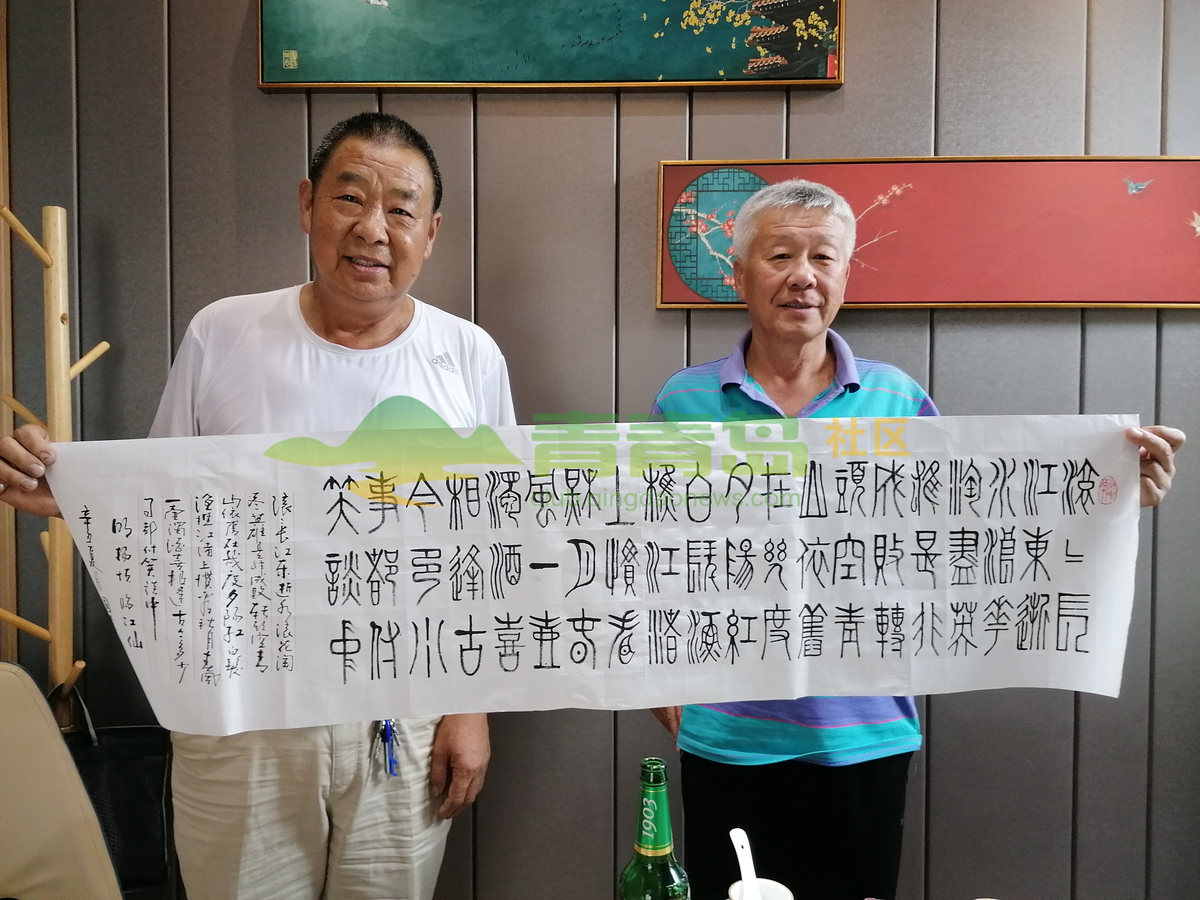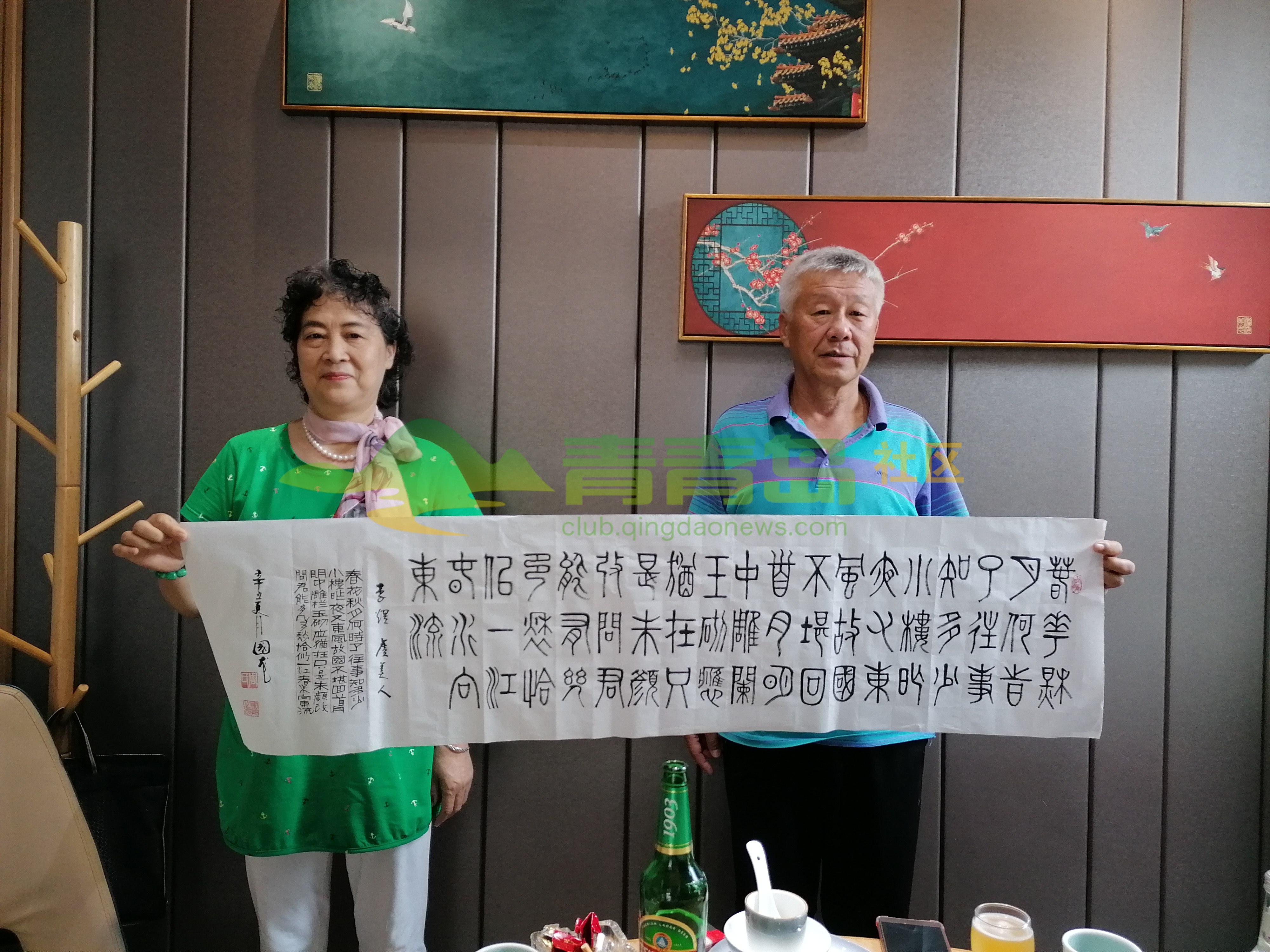 2021年7月4日中午,本身就是雕刻家书法家的陈诚瑜先生在“宴海小馆”特别设宴宴请了他十分敬佩的岛城最资深书法家王峰昌(左堂)、著名画家赵熙华、王峰昌徒弟书法家周国龙和王仙坡孙女王君平女士,作家李岩作陪。书画界的老朋友相见,分外亲切。周国龙先生将自己精心创作的三幅“篆书”等作品分别送给大家,大家都为周国龙在师傅王峰昌老师指导下书法方面的飞速进步而高兴!