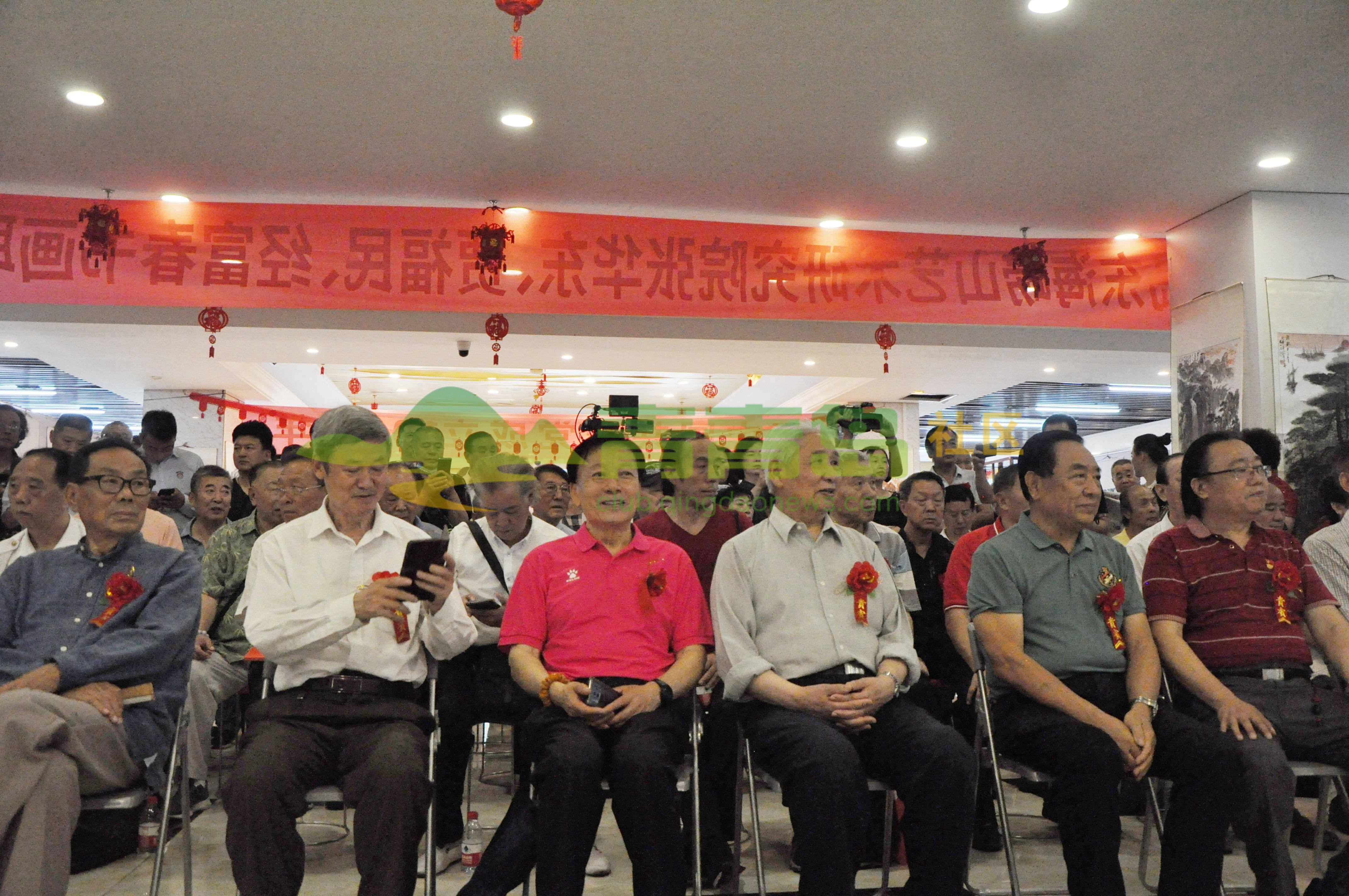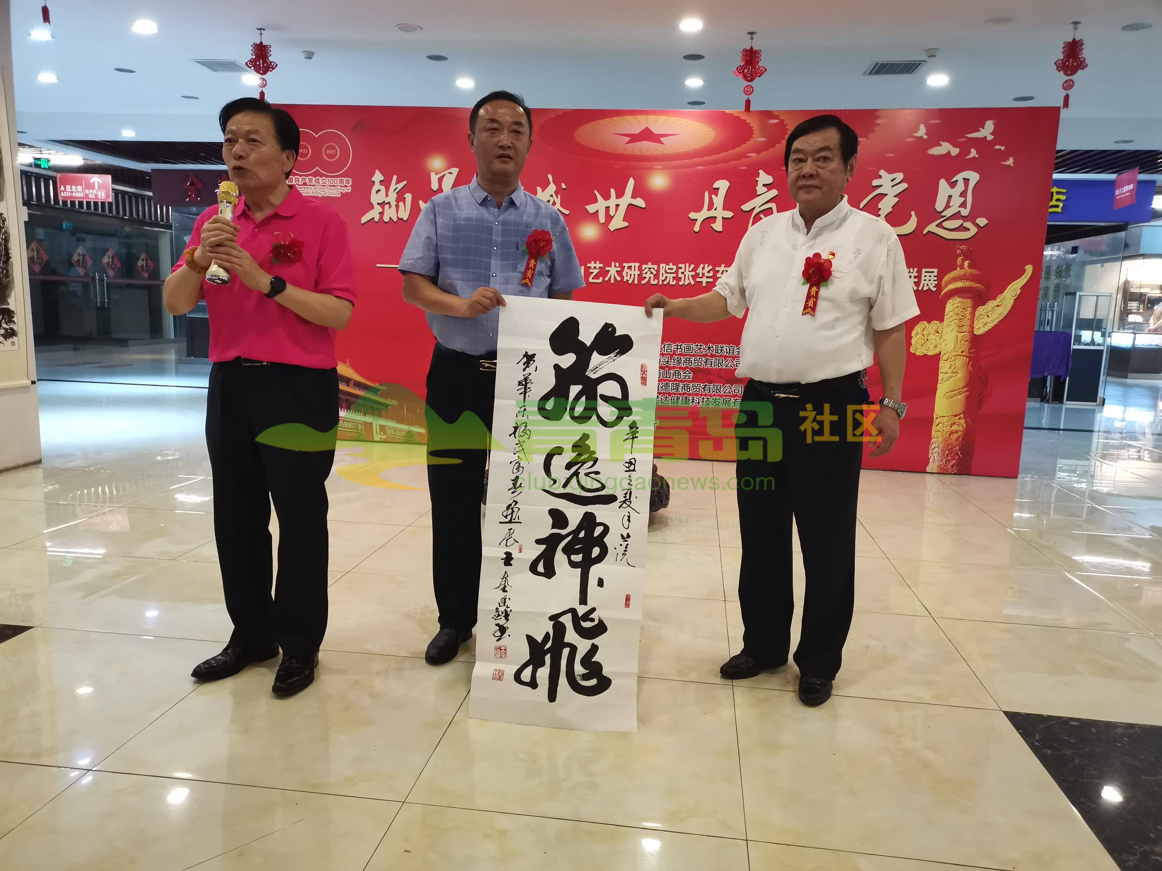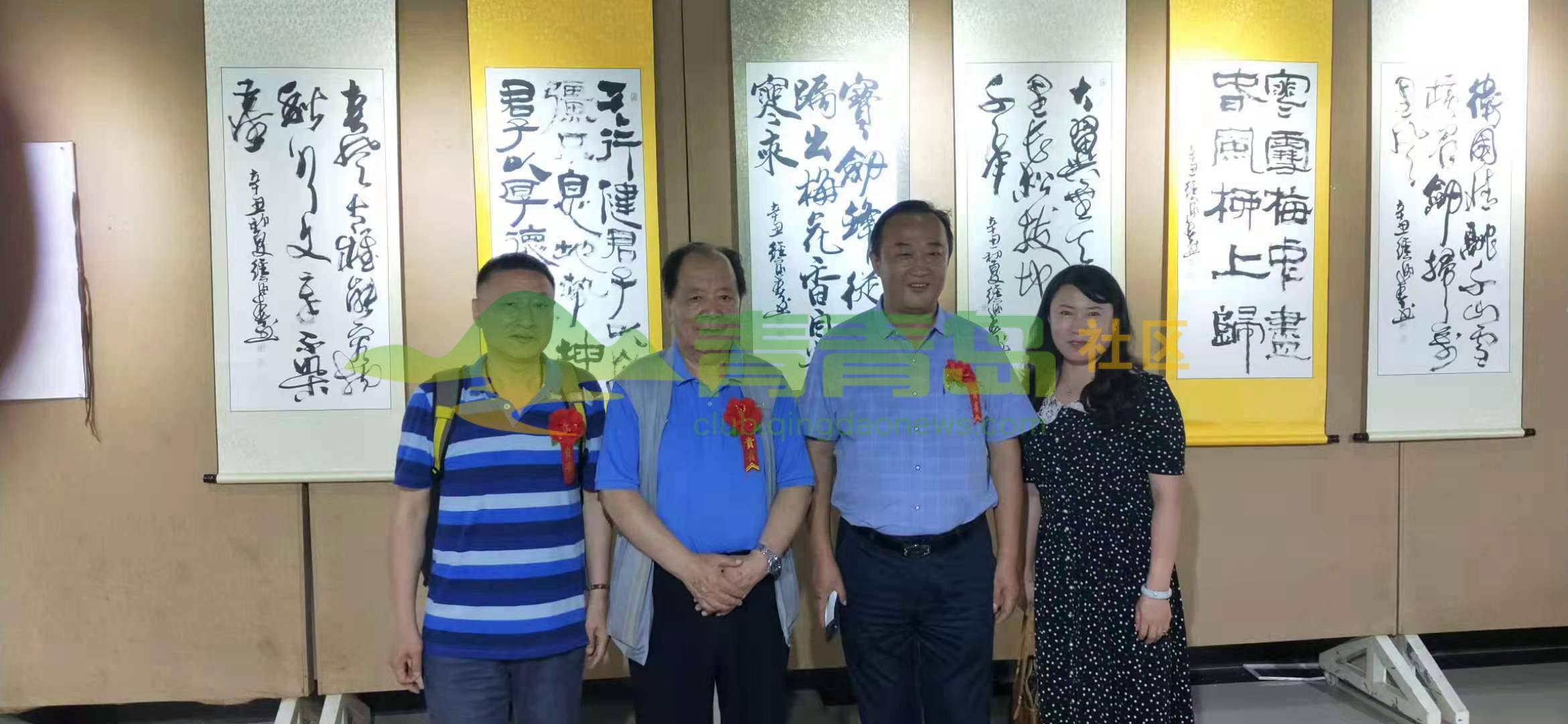 左起:著名书法家姜言夫、文化达人魏书训、知名书法家王奎鑫、何昌运少将、傅渤海少将、青岛东海崂山艺术研究院院长张华东