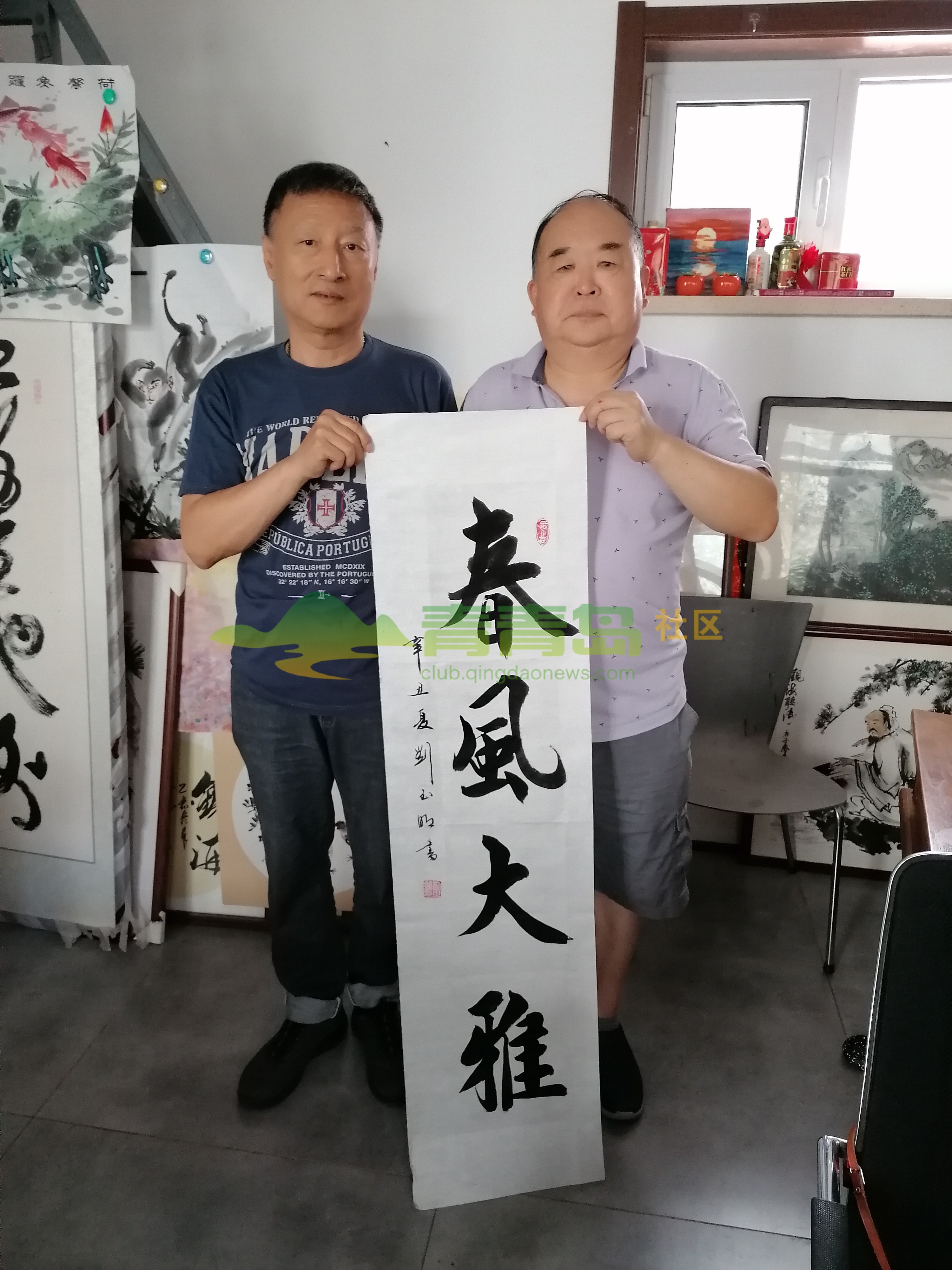 2021年8月5日,青岛仍是热浪滚滚,一个闷热的天气。但是,在栈桥附近的青岛通胜源工贸有限公司工作室,室内凉风习习,书画家们不辞辛苦,正在进行一次老朋友间的友情交流书画笔会。青岛市书法家协会副主席张景应老朋友魏鸿山董事长之邀,欣然应允,在现场一脸书写了多幅书法作品,每幅作品内容不同,笔体各异,呈现出“书卷气”文人书法风范,作品老辣生动,古朴典雅,“返老还童”,内涵丰富!号称“文化大咖”的青岛市楹联艺术家协会副主席刘玉明,被岛城书画界成为“模范书法家”,书写过程中任劳任怨,一丝不苟,作品规范大气,根底深厚,颇受大家的欢迎!青岛市楹联艺术家协会李沧分会主席、岛城资深画家辛华,花鸟、山水、人物诸方面皆佳,他画的梅花,独具特色,清新脱俗;他画的山水画作,朦胧奇崛,浓淡相宜;他画的灵猴,动感十足,醉人心脾;他画的奔牛,牛气冲天,扭转乾坤。总之,书画家们优秀且琳琅满目的作品,受到在场朋友们的盛赞,把整个笔会活动渲染得气氛活跃,群情激奋!