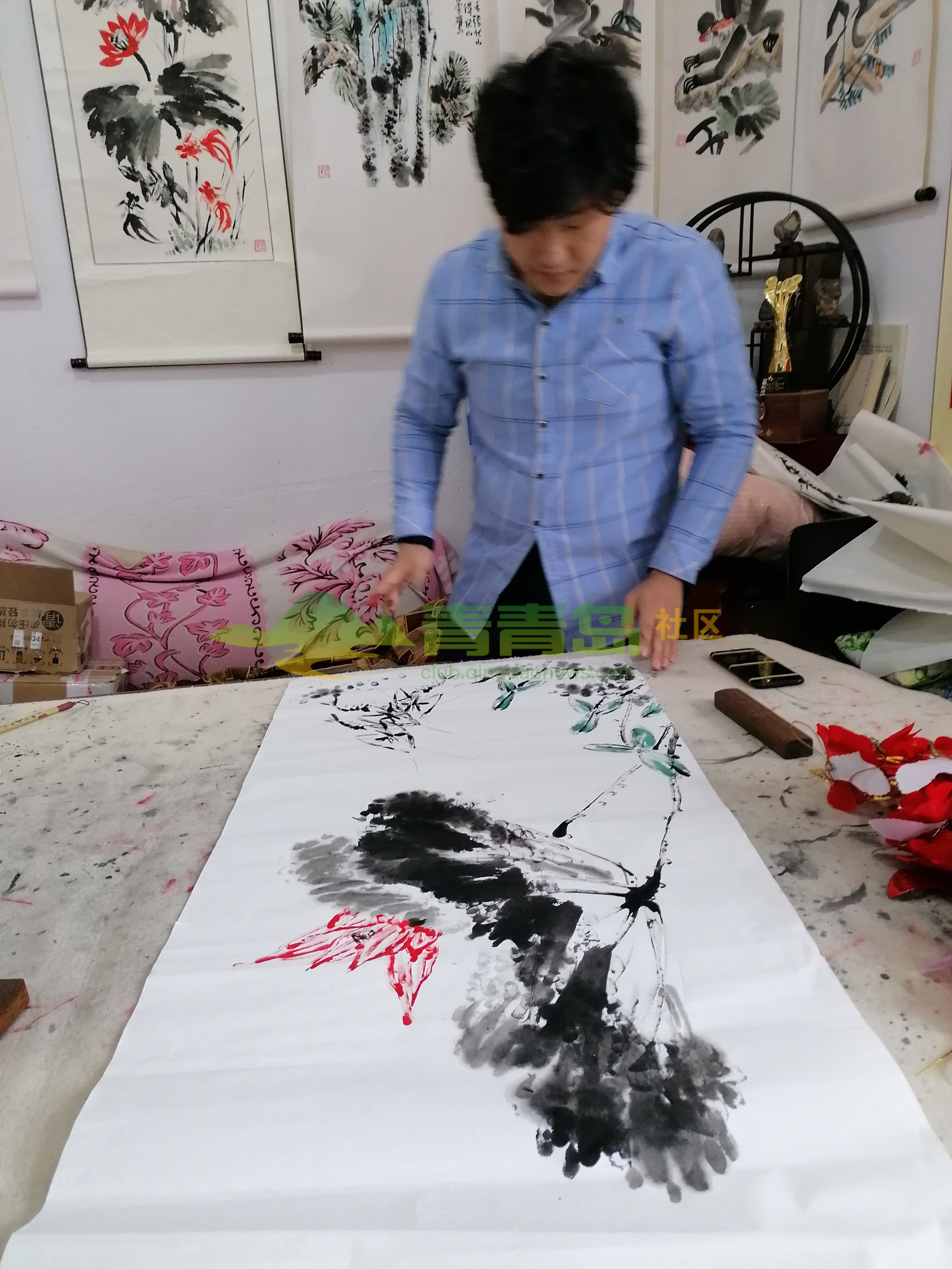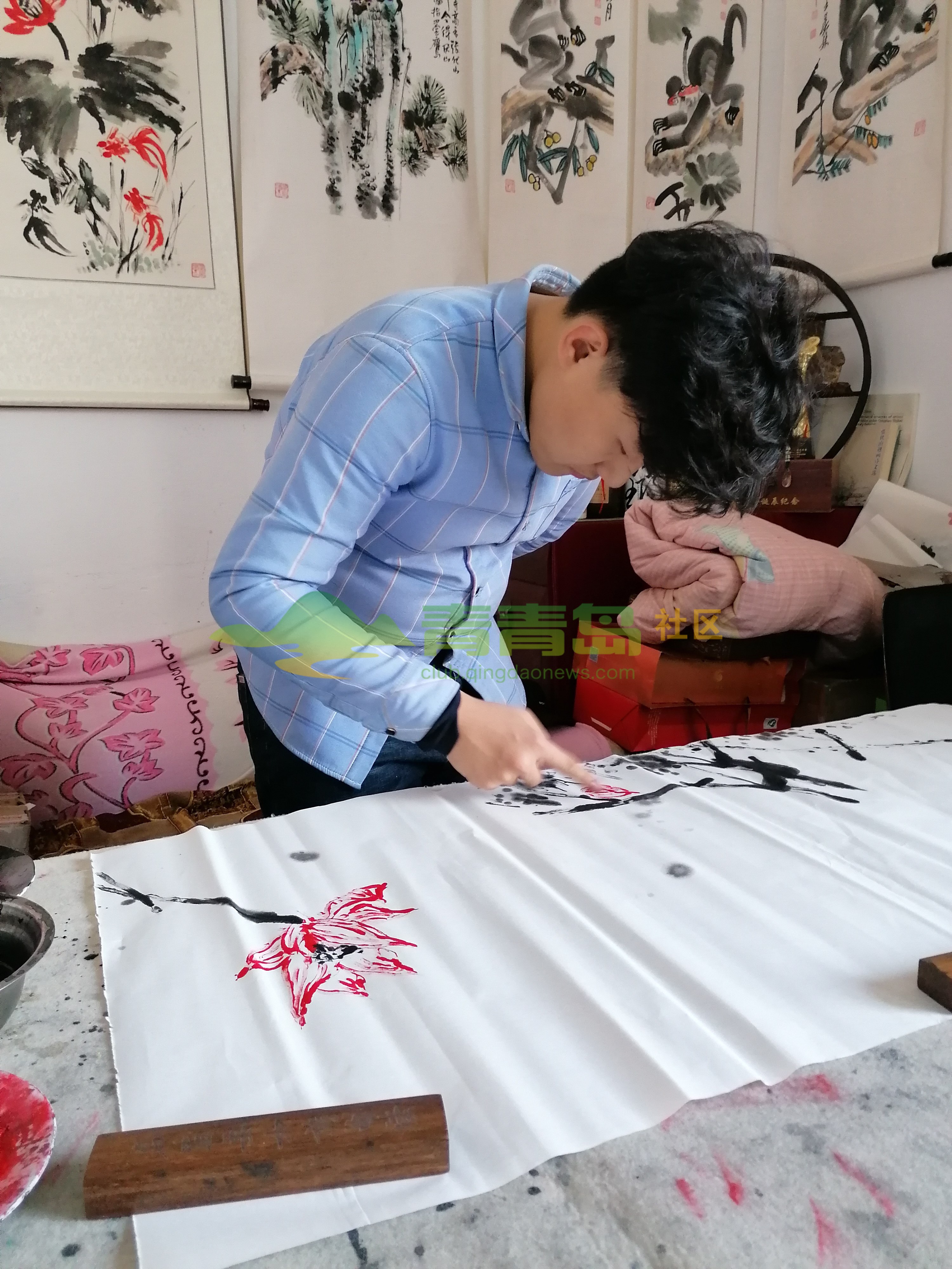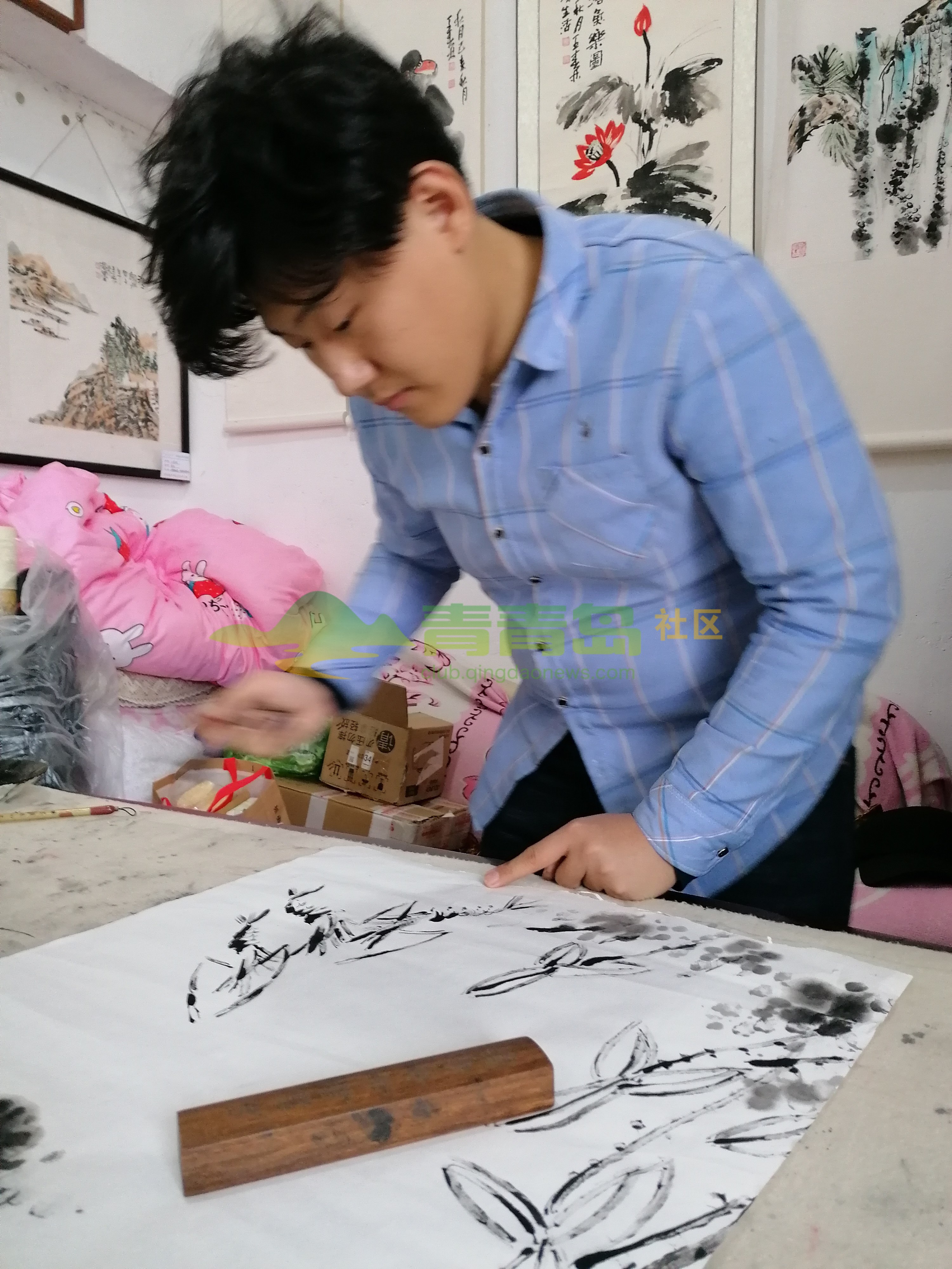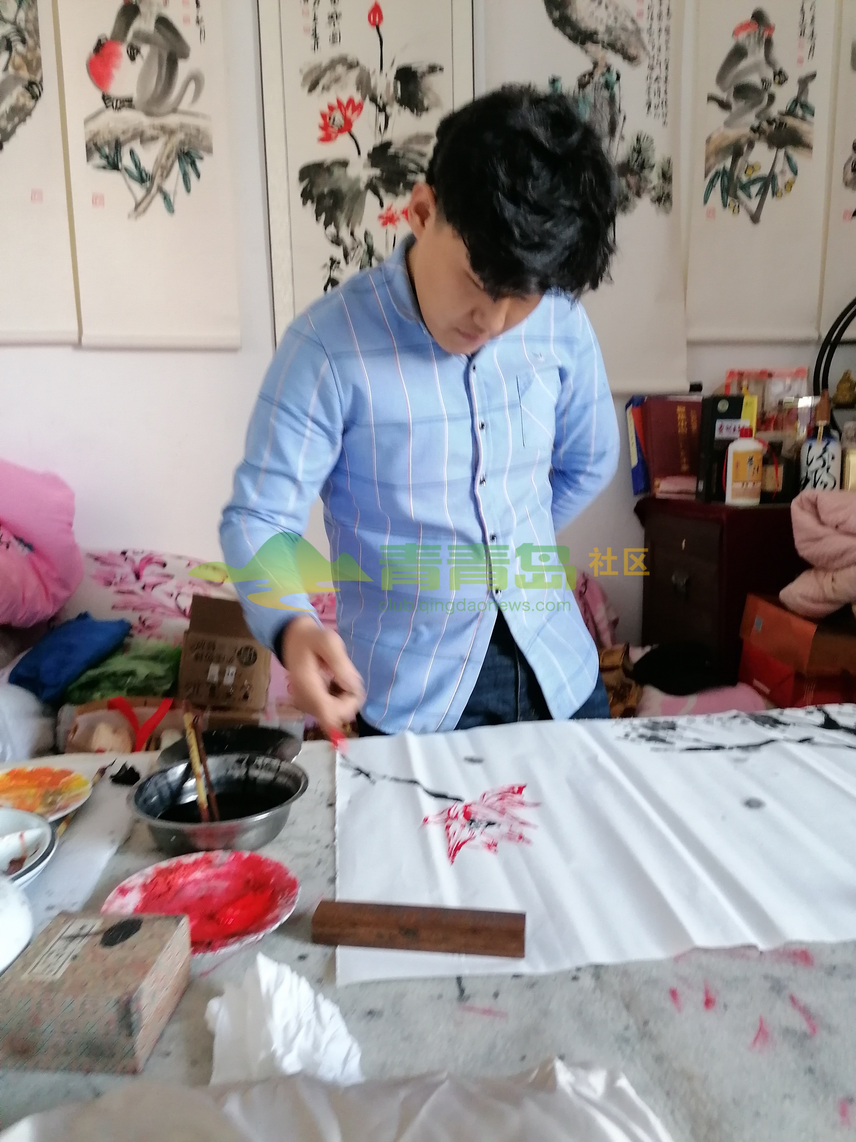 勤学苦练,见缝插针——青年画家张玺淏指墨荷花雅赏:青岛李岩摄影报道