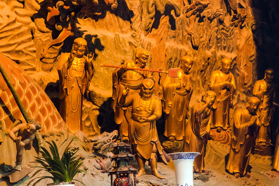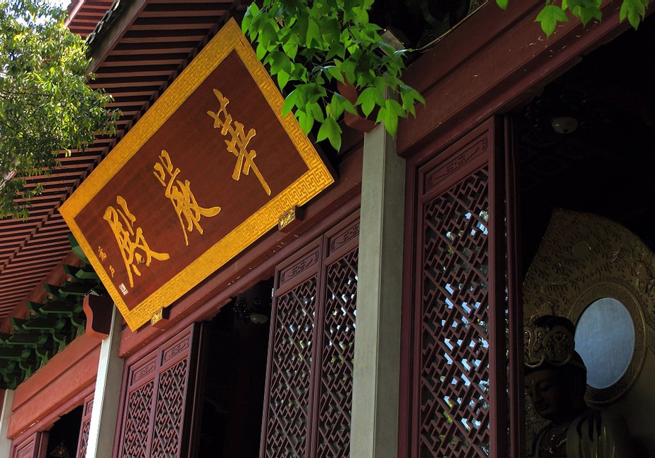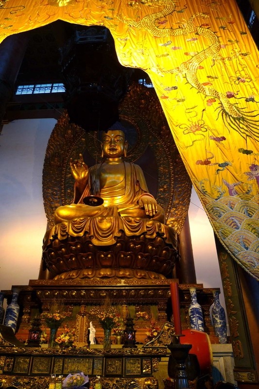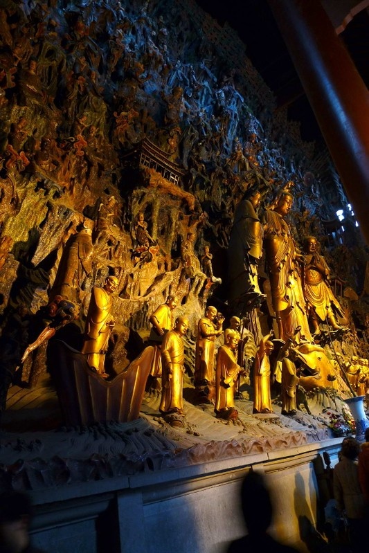 该殿为三层重檐构造,高达33.6米,雄伟庄严。殿内正面为释迦牟尼莲花坐像,妙相庄严,颔首俯视,在阳光的折射下,更是金光四射,令人敬畏。这是我国最高大的木雕坐式佛像之一。大殿两侧为十八罗汉造型,姿态各异,栩栩如生。释迦牟尼像的背面,有一座彩色“五十三参”海岛立体群塑,全由泥塑成,大小佛像150尊,姿态迴异,表现了一个生动悠远的佛教故事。说的是善财童子南游,跋山涉水,艰难竭蹶,参拜了53位名师,终得佛果。这座立体群雕,下面是波涛汹涌的大海,自顶至底,塑成一座巨大的海上仙山,在断岩峭壁、玲珑岩穴之间,五色祥云氤氲缭绕,佛象参差错落,大慈大悲救苦救难观世音菩萨居中,她足踏鲸背,意态潇洒,手执净瓶,“法水”汨汨而出,倾注在奔腾的涛声中。