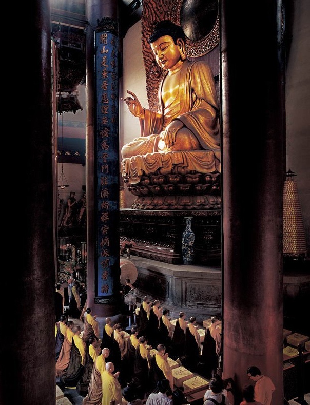 经过天王殿后的庭院,便进入灵隐寺的主殿大雄宝殿。走在石阶上的时候,便听到了唱诵经文的深沉低回的声音。让人感觉到了一种肃穆,一种无与伦比的庄严。数百名僧人及朝拜者,面朝大殿,或谦恭屈身,或双膝跪地,神情专注地唱诵。透过人群,隐隐可见几个身披袈裟的主持,正神情肃穆地合掌面对佛像领诵。前来朝拜的人,也一样深情专注,一字一句跟着唱诵。青铜般的韵律,让人感到月华如水般蔓延过来,又如纷飞的落叶飘落下来。唱诵经文的声音汇成了来自遥远天庭的召唤,灵魂在这召唤中发出从没有过的震颤,整个世界似乎一下沉寂在那心无杂念的虔诚中……
