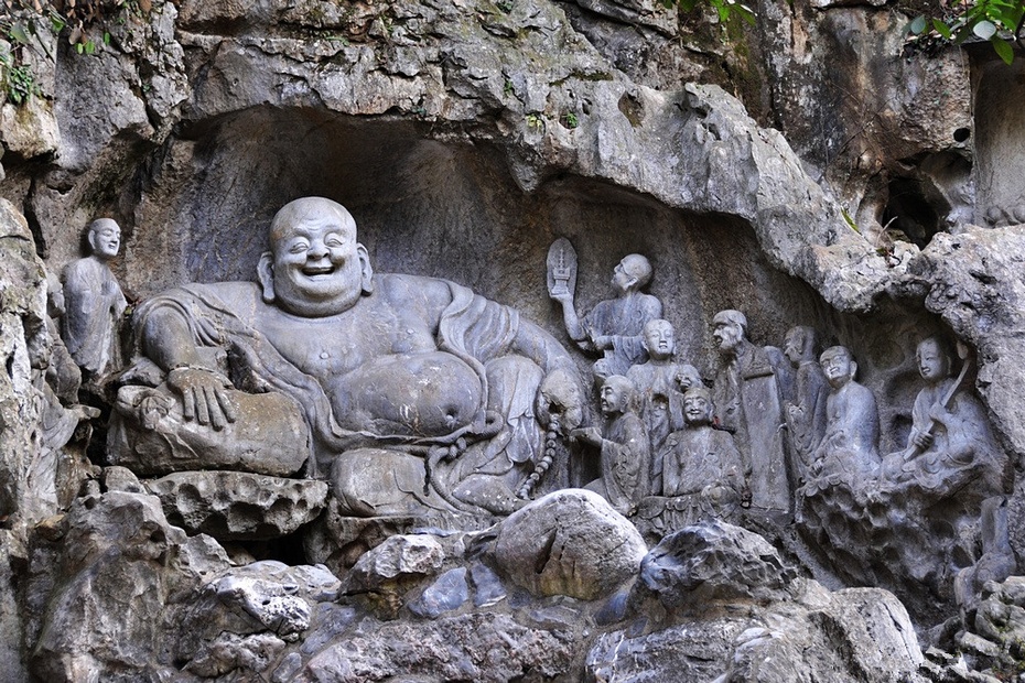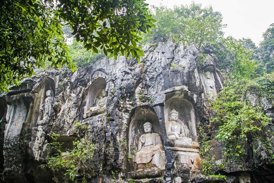 在飞来峰诸洞穴及沿溪间的峭壁上,雕刻着从五代至宋、元时期的石刻造像470多尊。年代最早的青林洞入口靠右的岩石上的弥陀、观音、大势至等三尊佛像,为公元951年所造。南宋大肚弥勒像是飞来峰造像中最大的一尊,也是我国现有最早的大肚弥勒。那坦胸露肚、笑口常开、“容天下一切难容之事;笑天下一切可笑之人”的形像,吸引游客竞相摄影留念。