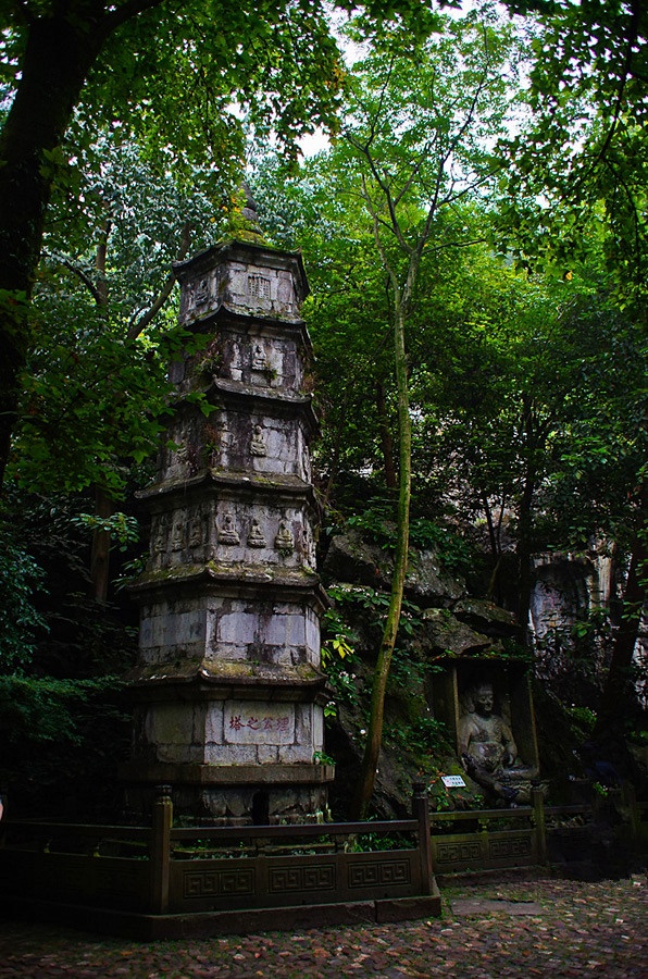 飞来峰龙泓洞口旁,便是埋葬灵隐开山始祖慧理和尚骨灰的“理公塔”。该塔高约8米,用石块砌成,六面六层,殊为罕见。全塔由下至上逐级收分,结构朴实无华,别具一格。