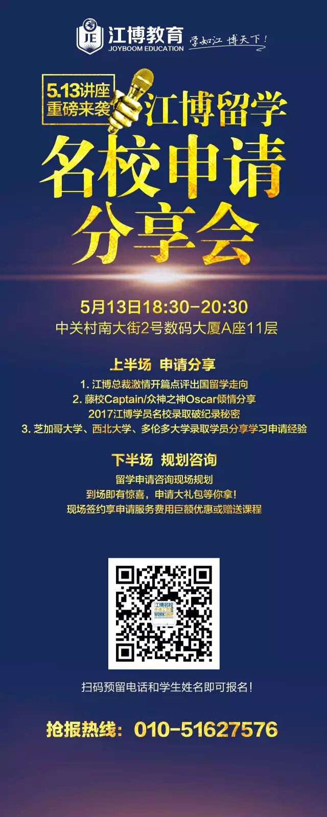 更多录取详情,选校策略,文书秘密,请来【2017江博名校录取分享会】
