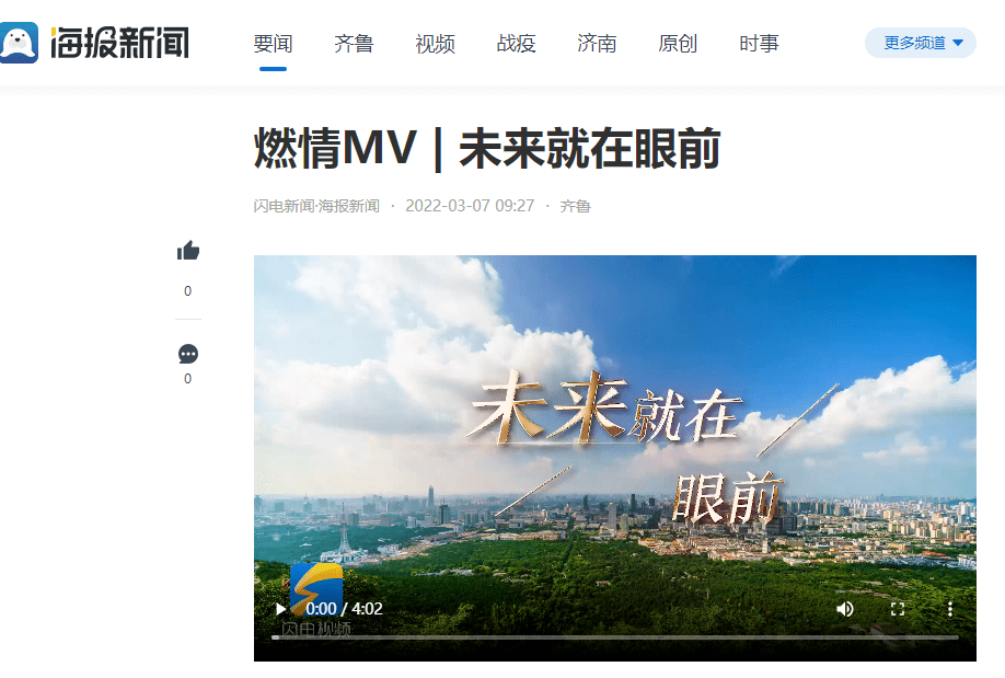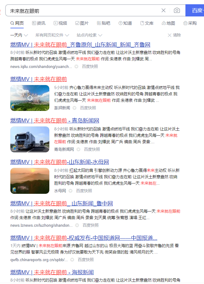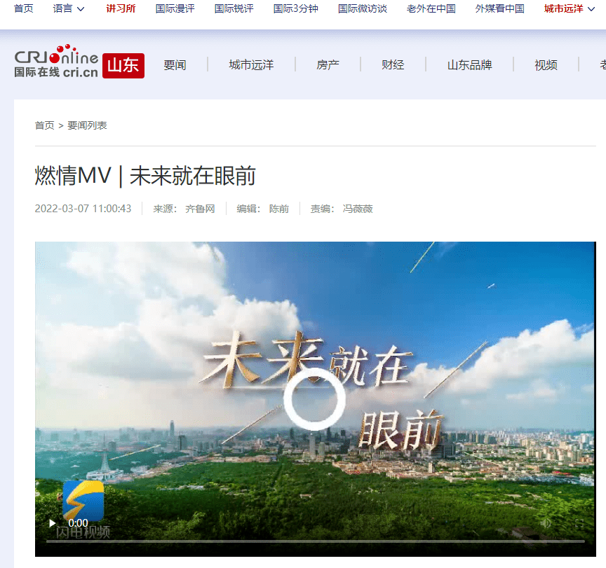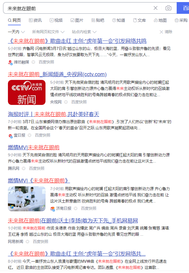 “越过山东的山,极目大海的蓝,用奋斗致敬齐鲁的先贤……”3月7日,由山东省委网信办推出原创歌曲《未来就在眼前》在全网进行了刷屏。央视网、新华网、中国报道网、闪电新闻、大众日报等全国上百家媒体进行了报道和宣传。