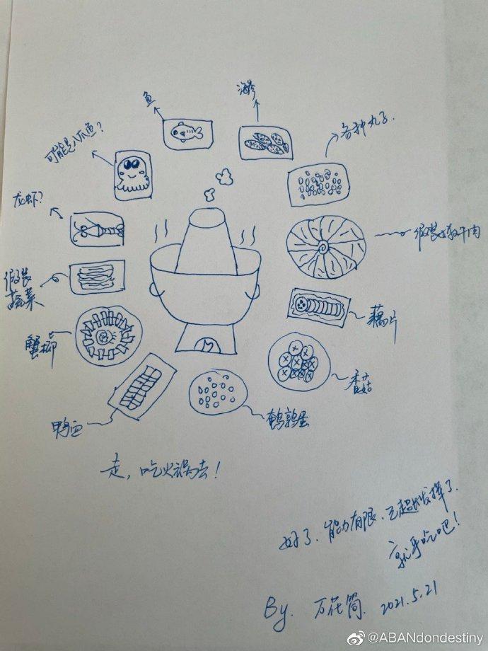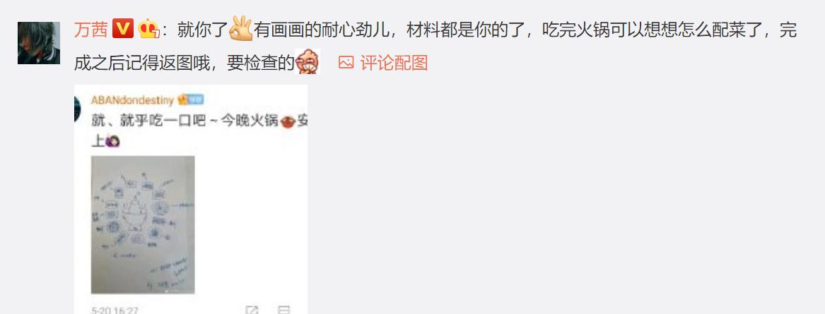 不过最后有热心粉丝给万茜手绘了一幅配菜指南,被万茜本人翻了牌子,成功收获万茜送出的火锅食材大礼包哈哈哈,真的是一个敢画一个敢送,粉丝与艺人之间的互动真的是可可爱爱。