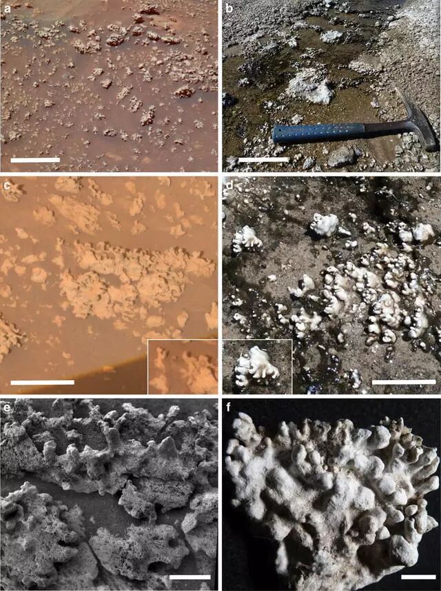 无论从宏观形貌上,还是微观特征上,El Tatio地区和火星上的沉积物之间都表现出了一种极为密切的相关性。这些SiO2沉积物裹了一层微米级的石盐(Halite,NaCl)包壳,被认为是喷孔热液活动的关键证据——它们是富含氯离子的热液在输出通道上留下的沉淀物。石盐极易溶于水,但得益于El Tatio地区独特的干燥气候特征,这些含有微米级石盐壳的沉积物有幸能够保留下来。如果用它来解释火星上那些相关性良好的对应物,人们就可以大胆地说明,勇气号找到的,很可能就是火星当年一个活跃的热液喷发孔。