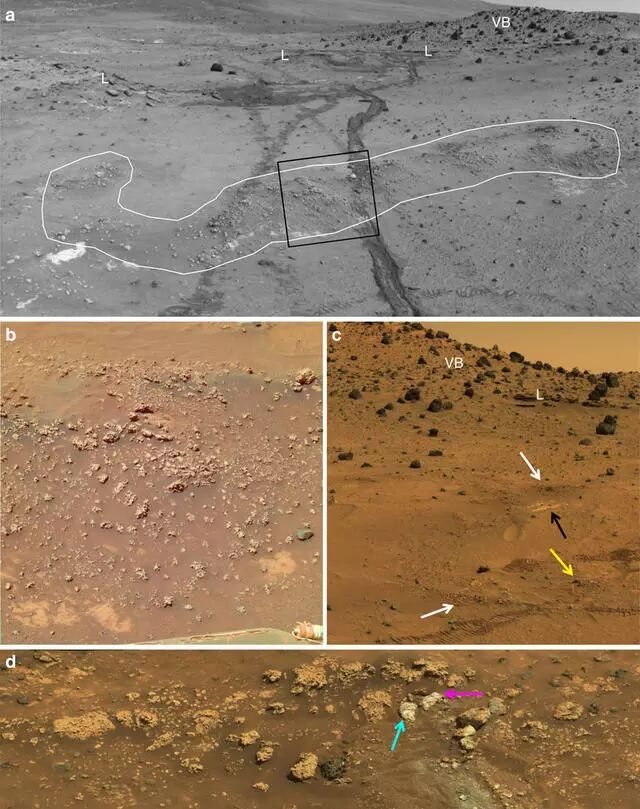 考察这些蛋白石的上下地层可以发现,它正好位于两套镁铁质火山岩之间。地质学家利用将今论古和将地论天两大原则,推断当时火星上富含热液活动。高温热液能够轻易地把上下火山岩地层里的Fe离子和Mg离子从岩石的分子骨架中淋滤掉,从而把Si和O筛出来。这样,过饱和的Si和O就凝固成了独立的蛋白石。至于这些热液活动产物代表什么沉积环境,鉴于那个时候也没拿出什么关键性的证据,渐渐也就没有了下文。毕竟,火星车时不时都会弄些大新闻传给地球,火星上能吸引大家的地方,实在太多了。