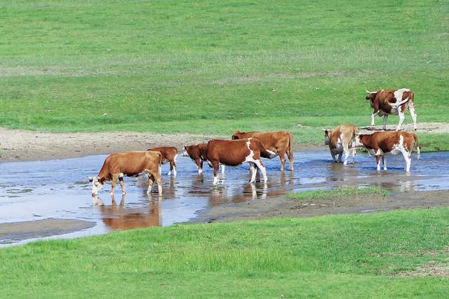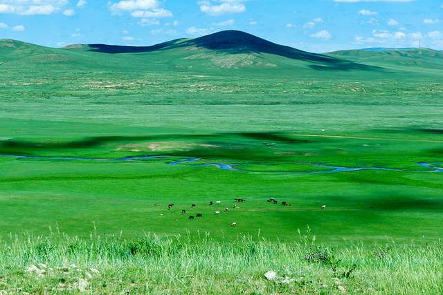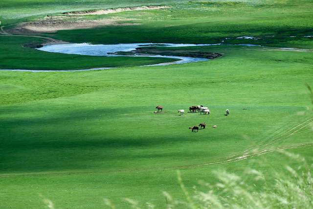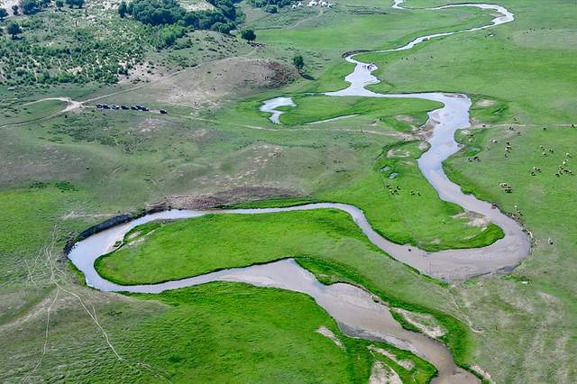 乌拉盖河是内蒙古第一大内陆河,九曲湾位于乌拉盖湖东面,与湖入口相连,河流蜿蜒曲折,似一条银色的哈达镶钳在绿色的大地上。河道位于景区深处,需要乘坐电瓶车才能抵达,河边淡化了夏日的炎热,带着清凉的风吹过你的身体,荡涤你的灵魂,这里的牛羊满山坡,形成了独特的自然风光,