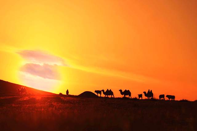 开车行驶于浑善达克沙地中,处处皆风景。沙丘的黄色是这里的底色,青色的柏油路穿沙而过,白色的风力发电机连片“扎根”,野兔、狍子偶尔出现在道路两旁,大大小小的不知名野鸟在空中盘旋。绿色的草丛,一堆堆一簇簇,还有歪歪斜斜的蓝旗榆点缀其间。牛马羊是最常见的动物,它们或行或卧于蓝天黄沙之间,每当夕阳西下时,成群结队回家的牛马羊群是一道独特风景,让人心神辽阔。