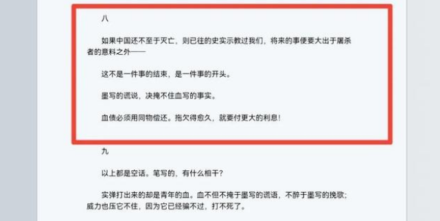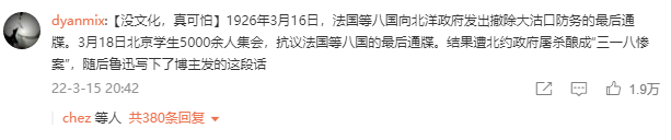 “这句话出自《无花的蔷薇之二8》,创作背景1926年的是三一八惨案,元凶就有法国。后面还有句‘血债必须用同物偿还,拖欠得越久 就要付更大的利息’,你现在发出来是啥意思?提醒我们要让你们还血债了?”