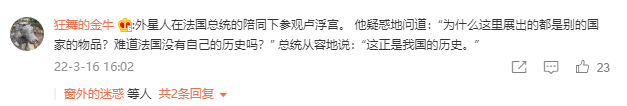 有网友当场在下面编段子:“外星人在法国总统的陪同下参观卢浮宫。 他疑惑地问道,为什么这里展出的都是别的国家的物品?难道法国没有自己的历史吗? 总统从容地说:这正是我国的历史。”
