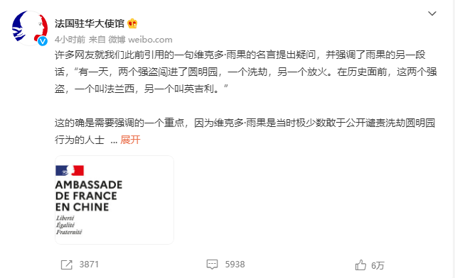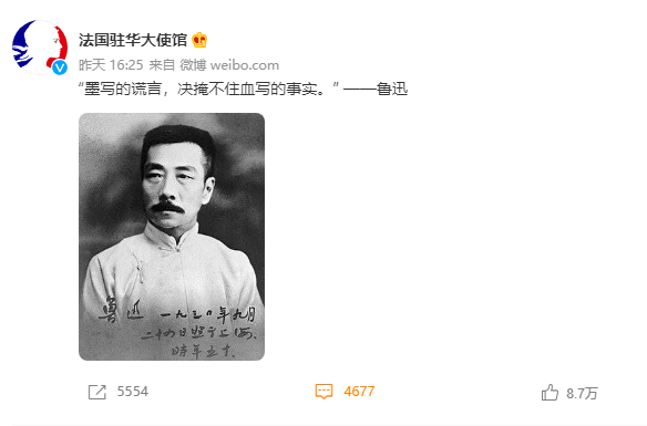 场面火爆!法国驻华使馆大战十万网友:互飚鲁迅雨果名言