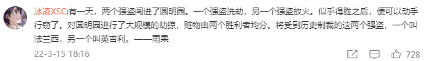 “有一天,两个强盗闯进了圆明园。一个强盗洗劫,另一个强盗放火。似乎得胜之后,便可以动手行窃了。对圆明园进行了大规模的劫掠,赃物由两个胜利者均分。将受到历史制裁的这两个强盗,一个叫法兰西,另一个叫英吉利。——雨果”