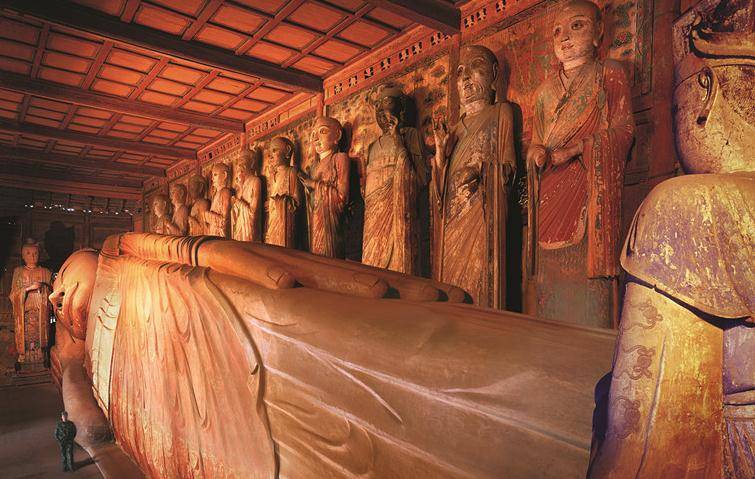 在卧佛身后有十大弟子举哀像,左右两侧是十八罗汉像。大殿四壁有明清壁画700多平方米,内容主要是佛经故事及《西游记》、《封神演义》、《山海经》等。