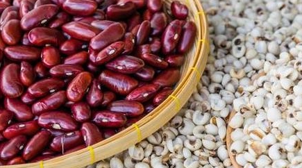 红豆:红豆富含铁质、叶酸等,具有利尿、消水肿、补血、改善血液循环、使气色红润等作用,而且红豆既能清心火,也能补心血与与薏米搭配有明显的健脾祛湿的排毒的功效。