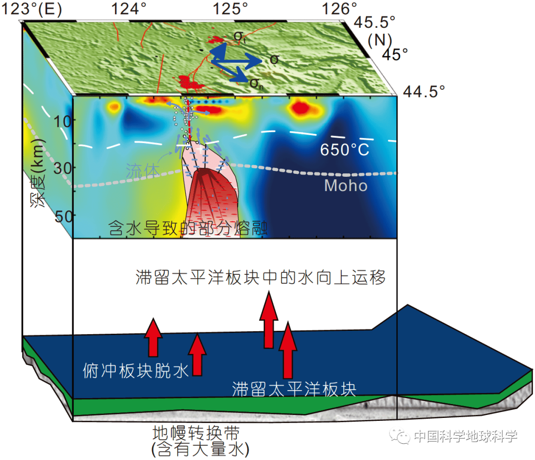 https://mmbiz.qpic.cn/mmbiz_gif/v1LeYw6K4z7KlsDZCmPsOLaTRVWrcySUtNEZTGl1GuQNbk6rT165b6vPGunG9fvhY2ibSaeicwRPVHLicJDlGPHRQ/640?wx_fmt=gif&wxfrom=5&wx_lazy=1 松原地震区是东北地区目前危险性最大的地震区之一。特别是自2006年以来,地震以震群形式持续发生了多次5级以上的地震,最大震级达到了5.8级。松原地震震中的分布主要集中在查干花地震区和宁江地震区。但关于地震根本成因,目前尚存在较大争议。地震机制解显示部分地震可能由断层引起,属于板内构造地震,但没有发现与地震相关的活动断层。定位的震中虽然存在某种优势方向,但不同研究结果所得到的震中优势方向也存在差异,不具有构造地震震中明显的线性分布特征。而震群型地震序列的出现、震源深度及其时间变化规律等特点,似乎支持诱发地震的发震成因。吉林大学翁爱华教授团队利用松原地震区面积性大地电磁测量,通过对观测到的数据采用三维模型反演技术,获得了地震区深部三维电阻率结构,进而给出了他们关于松原地震成因的研究发现。该研究以“松原地震与流体作用联系的大地电磁证据”为题发表在《中国科学:地球科学》2021年第1期。文章依据大地电磁探测电阻率模型,结合地震震中定位结果,推测纵贯松原地震区的北东向的隐伏扶余-肇东断裂为地震的控制断裂。研究还发现,在地震区地壳底部存在明显的低阻异常,该低阻异常与中地壳顶部和上地壳浅部的层状局部低阻异常联系。利用岩石物理实验结果,研究认为地壳深部的低阻异常由含水熔融物质引起。该含水熔融物质在温度和压力共同作用下在下地壳发生岩浆侵位释放出流体。这些流体在弱化扶余-肇东断裂岩石强度的同时,还通过增加断层内的孔隙压力降低断层的抗剪强度。在近东西向区域性压应力的剪切作用力持续作用下达到破坏强度,引起断裂失稳而诱发松原地震,而近地表的扰动可能提前触发该地震。结合该团队关于松原地区更深部岩石圈和软流圈的大地电磁探测结果,研究认为持续的西太平洋板块俯冲作用能够向包括地震区在内的中国东北地区深部不停地补给流体,从而使得松原地区出现持续的地震。因此,松原地震是板块俯冲、既有断裂、区域应力环境和深部流体共同作用结果,并可能由近地表扰动诱发(图1)。