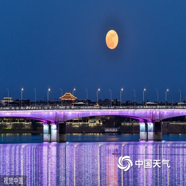 2022年6月14日,湖北襄阳,汉江上升起超级月亮。(叶强/视觉中国/版权图...