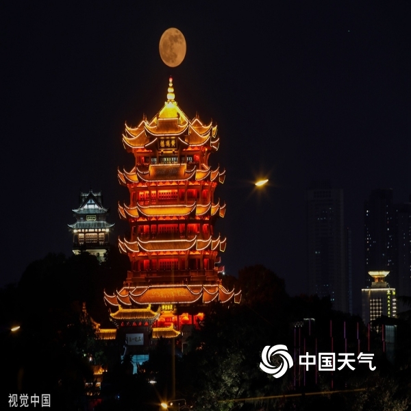 2022年6月14日,在武汉,超级月亮现身天穹,与黄鹤楼交相辉映。(赵军/视...