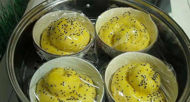 撒上黑芝麻8、上面盖上一层耐高温的保鲜膜,水开以后,大火蒸40分钟,锅里的水量一定要加足。