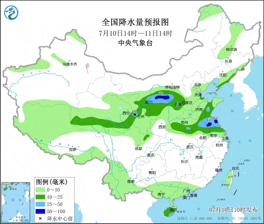 根据中央气象台预报,7月11日至13日,西北地区东部、四川盆地北部、华北中南部、山东、内蒙古东部、东北地区南部等地的部分地区有大到暴雨、局地大暴雨。上述地区累计降雨量普遍有30~60毫米,其中,甘肃东部、四川盆地北部、陕西中北部和西部、山西中南部、河北南部、山东北部、内蒙古东北部部分地区可达80~150毫米,局地可达180~220毫米。