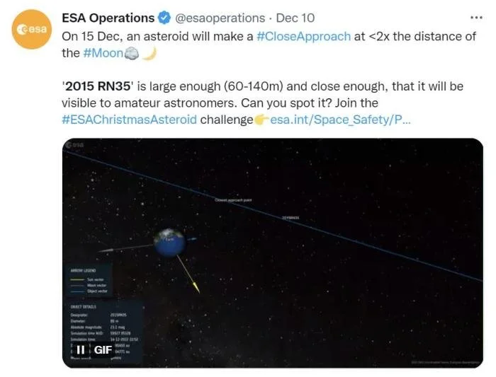 欧洲航天局推文写道,“小行星2015 RN35足够大,且飞得很近,可以被业余天文学家观测到。”