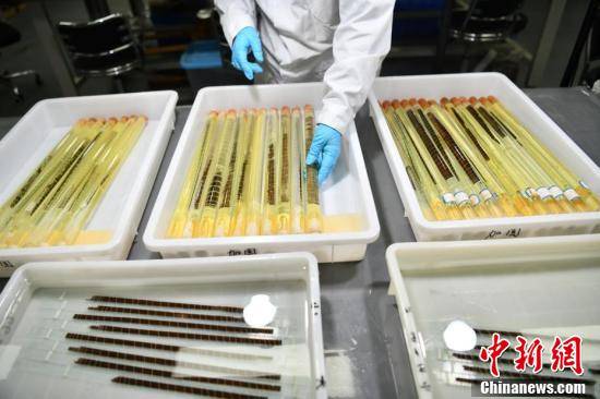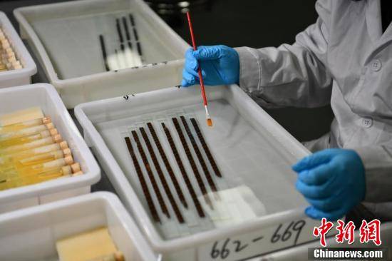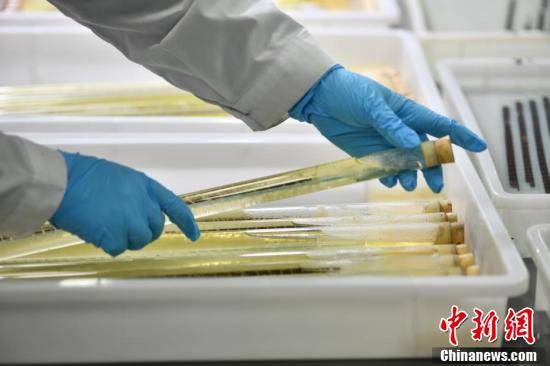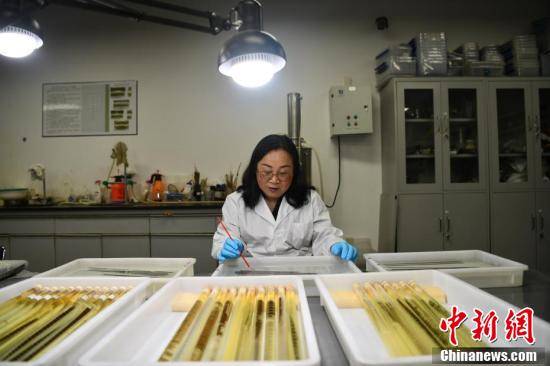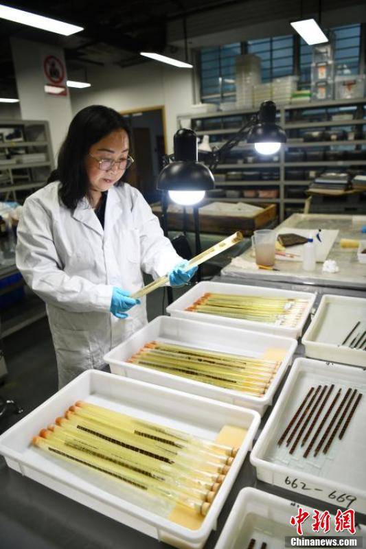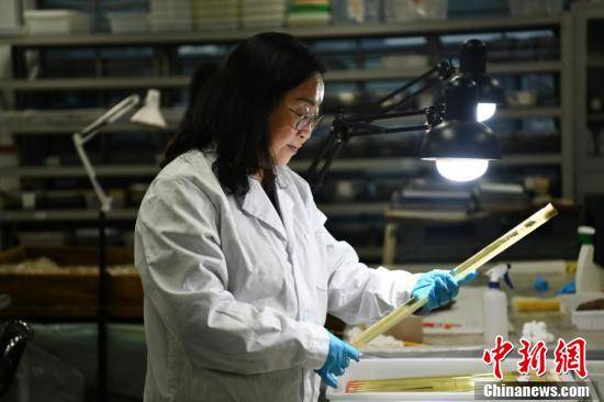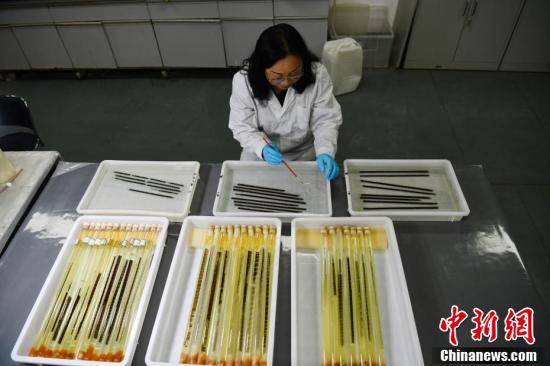 据成都文物考古研究院文保中心主任肖嶙透露,930支竹简在淤泥中埋藏了2000余年才得以面世,文保工作开展异常困难,历经10余年,“天回医简”的保护修复“曙光初现”,或于近两年便可完成,与公众见面。图为成都文物考古研究院文保中心主任肖嶙正在查看试管中的竹简脱水加固情况。张浪 摄