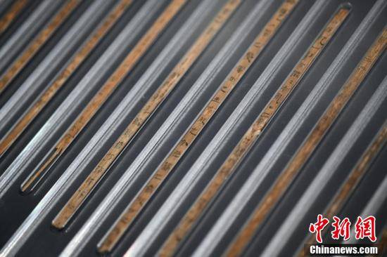 5月6日,记者探访成都文物考古研究院文保中心,直击“天回医简”文物保护修复现场。图为一支支完成修复后的“天回医简”,上面的文字清晰可见。张浪 摄