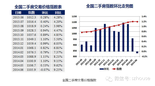 2014年6月,中国城市住房价格288指数——二手房价格60指数为1105.9点,较上月下降0.8点,环比下跌0.07%,同比上涨9.25%。