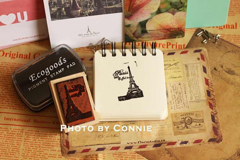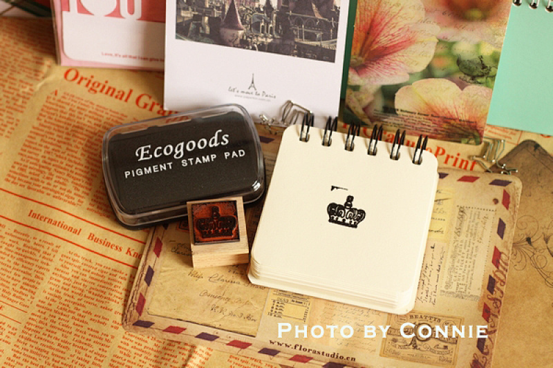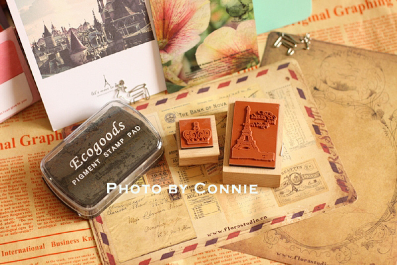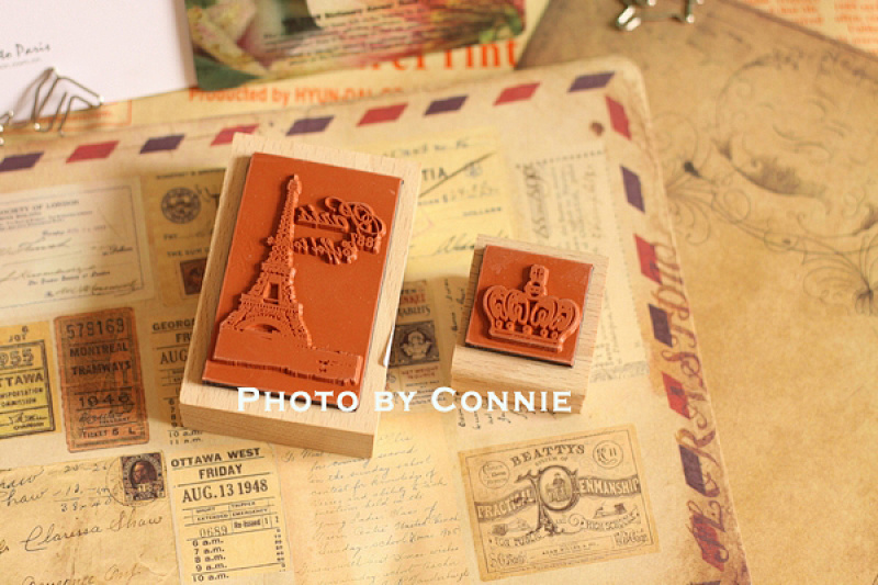 我买的是木质贴橡胶的印章(在橡胶上刻好图案贴在木头上),选的是铁塔和皇冠的图案,然后是黑色的印泥。