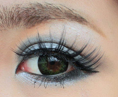 用银白色压在眼折上,让双眼皮看起来更宽。然后前眼头打亮。