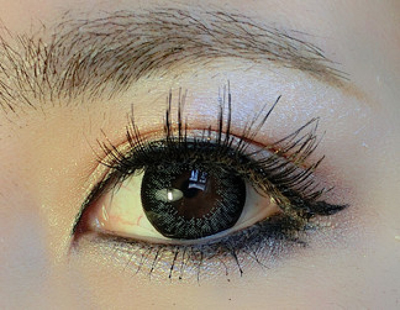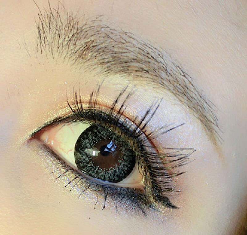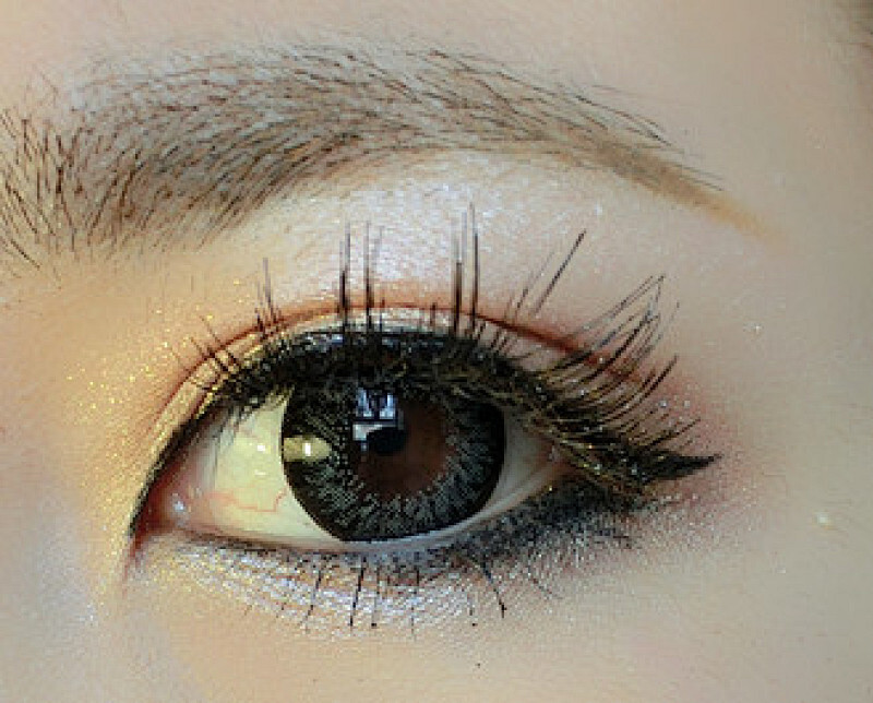 然后用单色眼影espoir 的浅肤金色涂在全眼皮部位(眼球凸起的部分)然后深的金咖色涂在眼折1/2处,后眼尾加重。