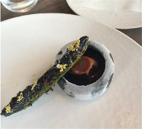烤小黄瓜,配蚂蚁和扇贝软糖(注意黄瓜上面一粒粒的大蚂蚁)