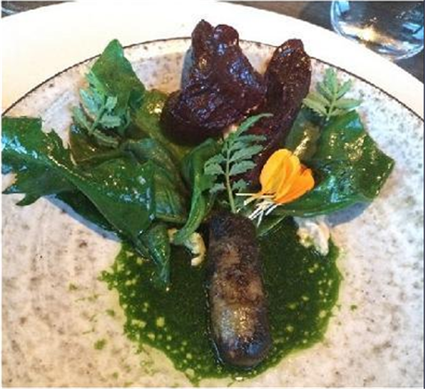 烤莴苣根,多种蒸的绿叶蔬菜,柠檬和马鞭草汁。