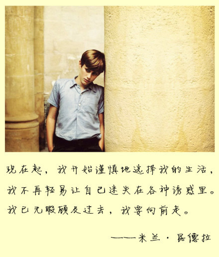 从现在起,我开始谨慎地选择我的生活,我不再轻易让自己迷失在各种诱惑里。我已无暇顾及过去,我要向前走。 ——米兰昆德拉
