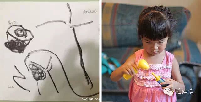儿子随手画了几笔,说这是风力发电机,山,蒙古包和蛇。