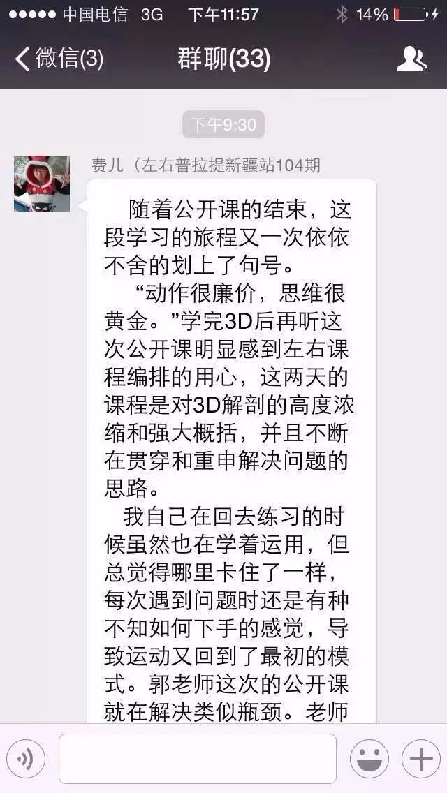 参加学习部分疆内优秀教练代表震撼纷纷感言:英雄不问出处,当了这么多年的教练,不管初出茅庐还是十几年行业资深,花了不少血汗钱,学习完才知道,学技术知其然更要知其所以然!不管你是瑜伽、普拉提,还是私人教练,不懂功能解剖的基础知识,你所掌握的康复知识充其量是纸上谈兵,盲人摸象,浮在表面!功能解剖一个教练将绕不过去的必修功课,迟早要修的学分!