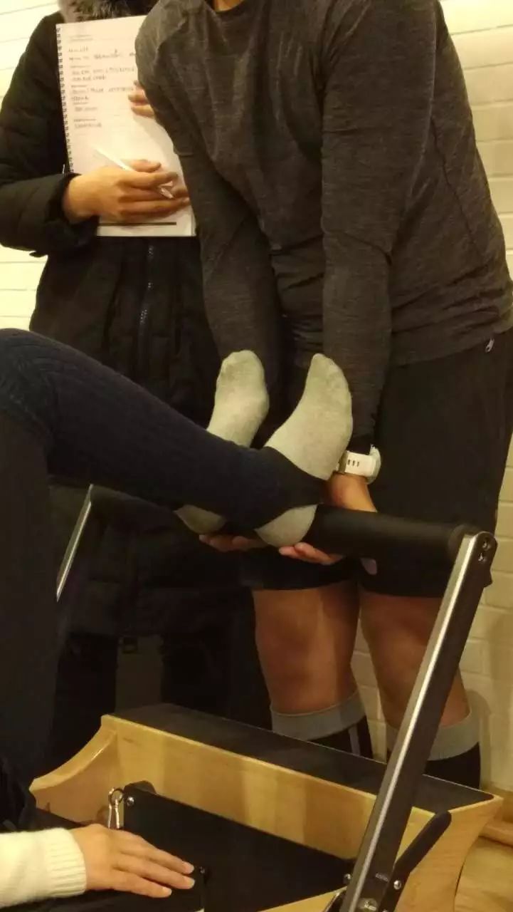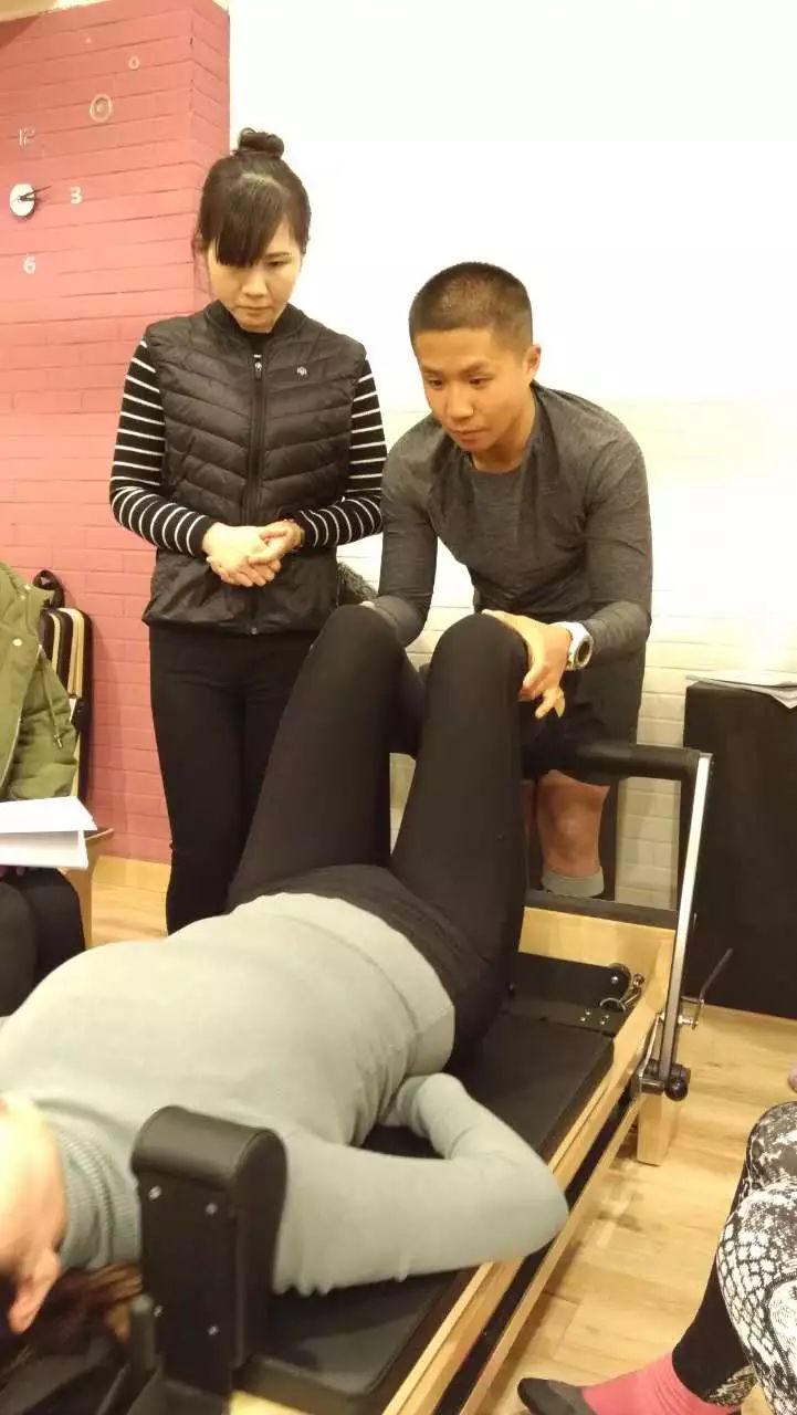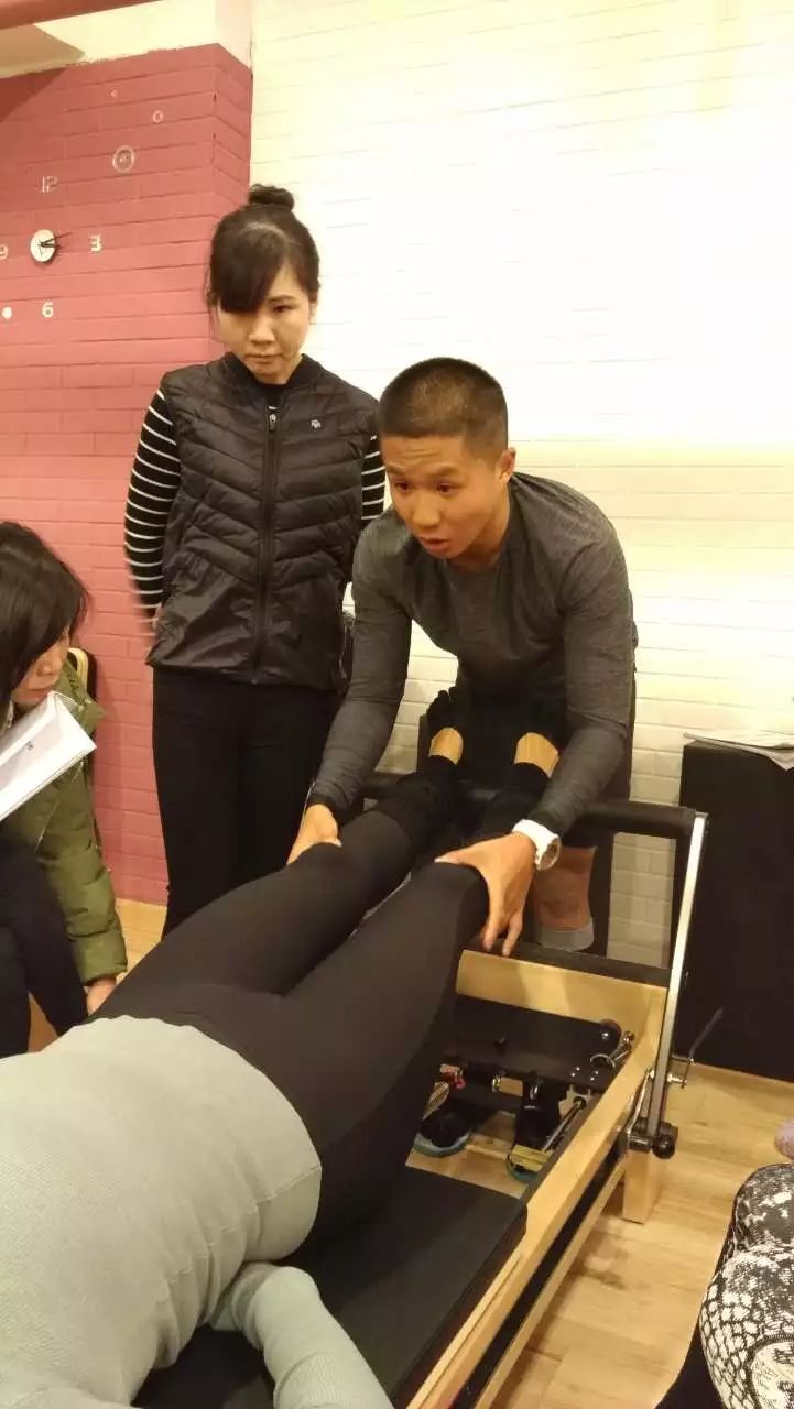 王子老师正在向学员讲授在滑动床上如何收紧臀部……